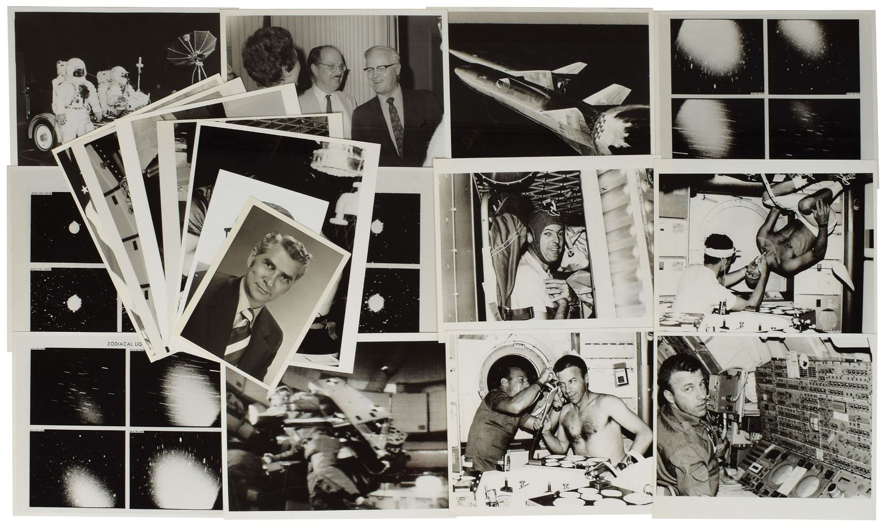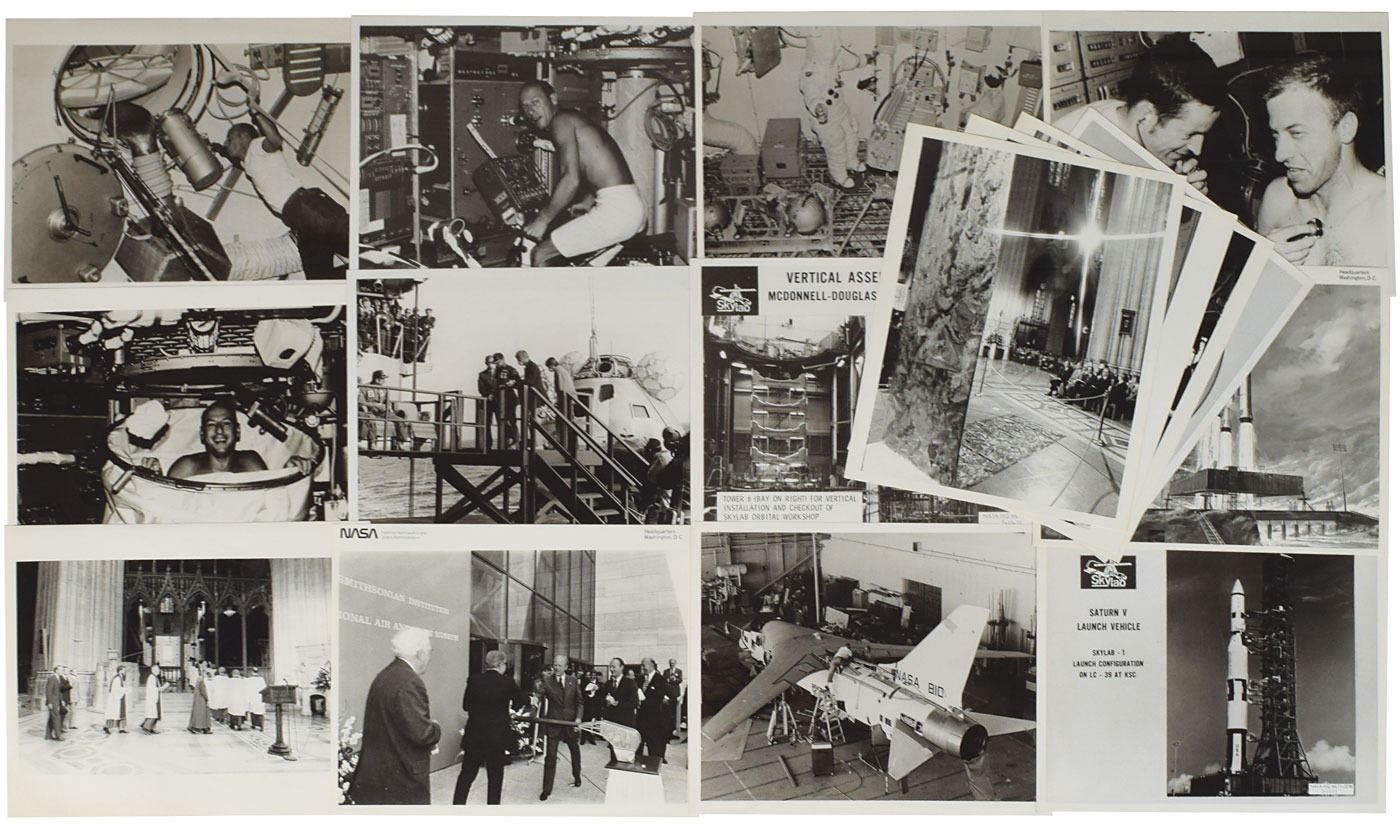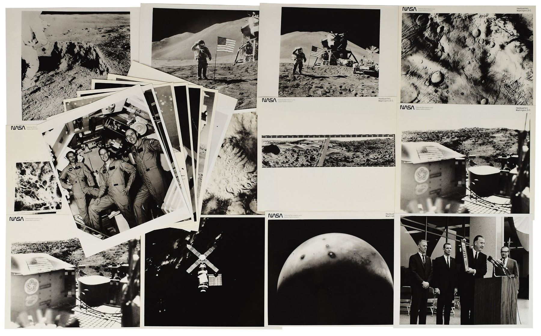 Collection of more than 50 circa 1970s official glossy NASA press photos, mostly 8 x 10 and 10 x 8, with subjects including: Dave Scott saluting the American flag on the lunar surface during Apollo 15; Jim Irwin saluting the flag during Apollo 15; several photos of the surface of Mars as seen by the Viking spacecraft; Californian land formations as seen by Landsat-1; the Skylab II space station; astronaut Richard Truly; astronaut Fred Haise; the Lunar Roving Vehicle; the Apollo 9 astronauts with Vice President Spiro T. Agnew; the second manned Skylab crew; zodiacal light as seen during Apollo 15; a lunar eclipse as seen during Apollo 15; the Skylab II astronauts during their mission; astronaut Joe Engle; Alan Bean during Skylab III; Charles Conrad during Skylab II; Space Shuttle concept artwork; a service at the National Cathedral for the fifth anniversary of Apollo 11; and various other photographs. Most bear purple NASA caption text on the reverse. In overall fine condition.