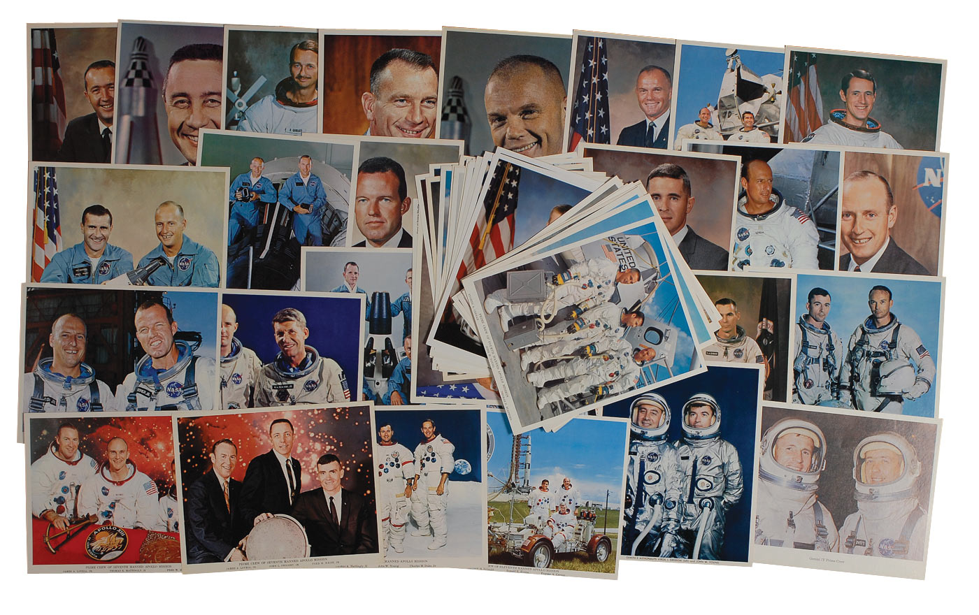 Huge collection of 85 unsigned NASA photos, both 8 x 10 and 10 x 8, almost all color. Photos are of various astronauts and crews spanning from Mercury to Challenger. Highlights include: Challenger crew photo, individual Challenger crew photos, Mercury Seven, and various other crews and individual portraits. In fine condition.