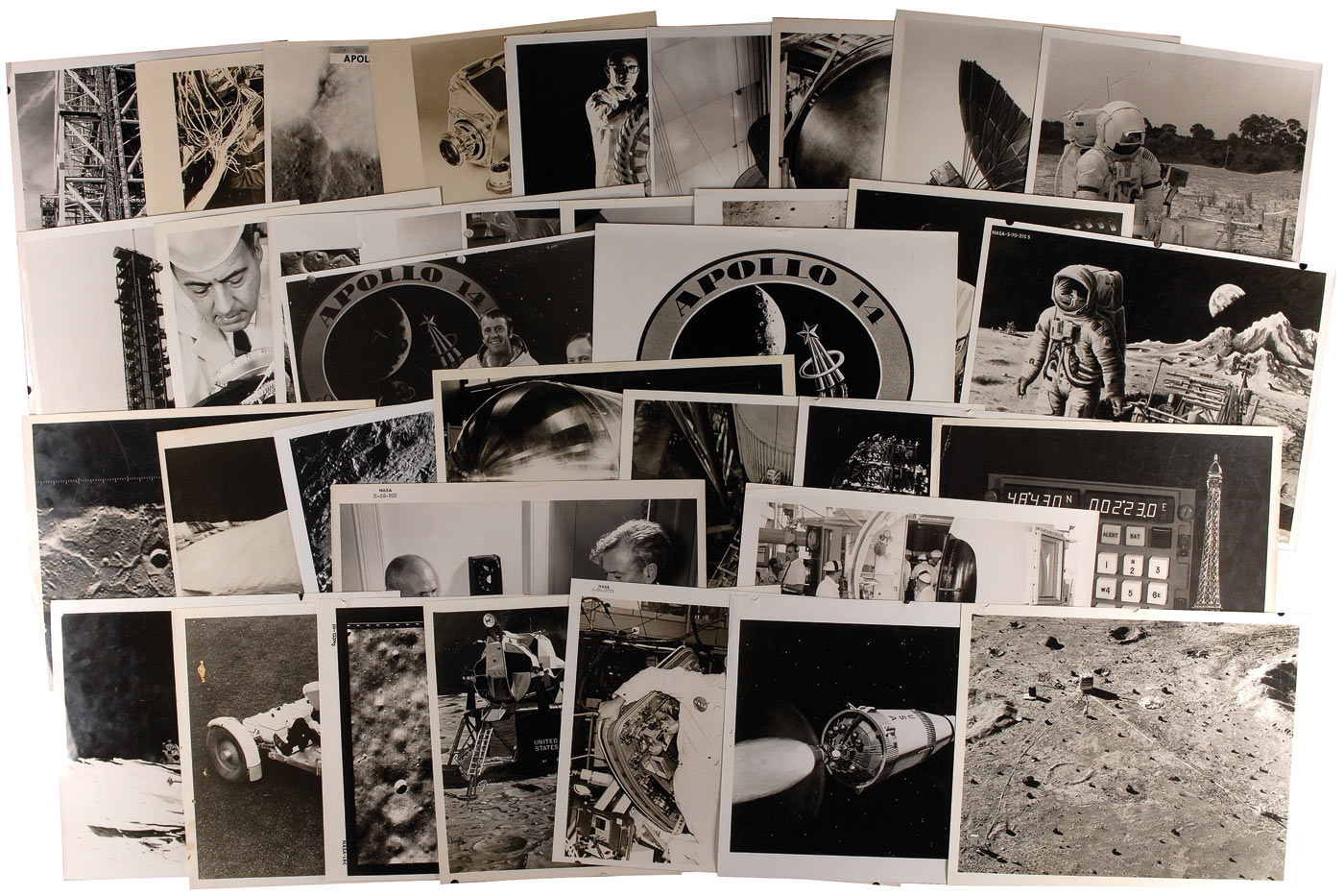 Collection of 36 unsigned vintage glossy NASA photos, both 8 x 10 and 10 x 8. Photos cover a wide range of subjects including mission and equipment preparations, crew photos, artist’s renditions of moon landings, training, and moon missions. In fine condition, with binder dings or partial punch holes to one edge of most of the photos.