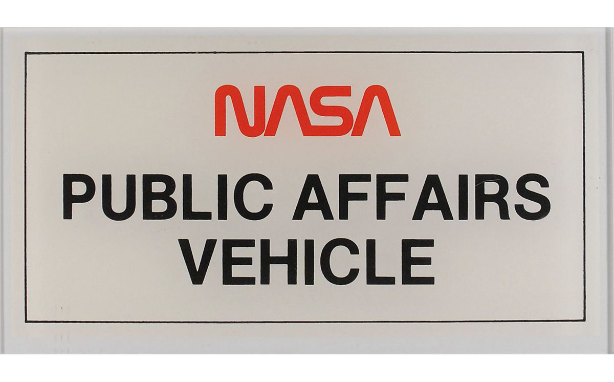 Printed NASA “Public Affairs Vehicle” sign, measuring 14.25 x 7.25, with the NASA ‘worm’ logo at the top. Sign is presented in Lucite to an overall size of 15 x 8. In fine condition. These signs would have been placed on the dashboard during parking at various Cape Canaveral/KSC sites.