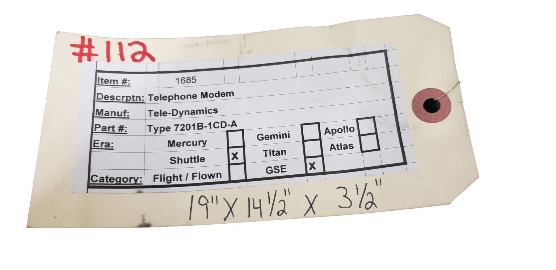 NASA Space Shuttle Telephone Modem Manufacturer Tele-Dynamics Part No Type 7201B-1CD-A Piece is 19" x 14 1/2" x 3 1/2" All items are from the Estate of Charles Bell space auction in May of 2000 All item for this Auction Located in in Hollywood Florida Warehouse For Shipping Call today for quote they have item numbers and Pak Mail is available for all your custom packaging and shipping needs. We can package, palletize, crate, insure and ship to any Domestic or International location. All packaging and shipping fees must be paid in full before shipment is released. On international shipments, consignee is responsible for all Duties, Taxes, Customs Clearance or any destination fees that apply. Please visit our website @ www.pakmail.com/us770 for contact information or to get a quote. (Let us know you are a winning bidder from the Puckett auction so we can correctly arrange pick up for your item) Telephone number is 954 522 4550 Pak Mail www.pakmail.com/us770 email us770@pakmail.com Monday Friday 9 am to 6pm Sat 10 am 3 pm