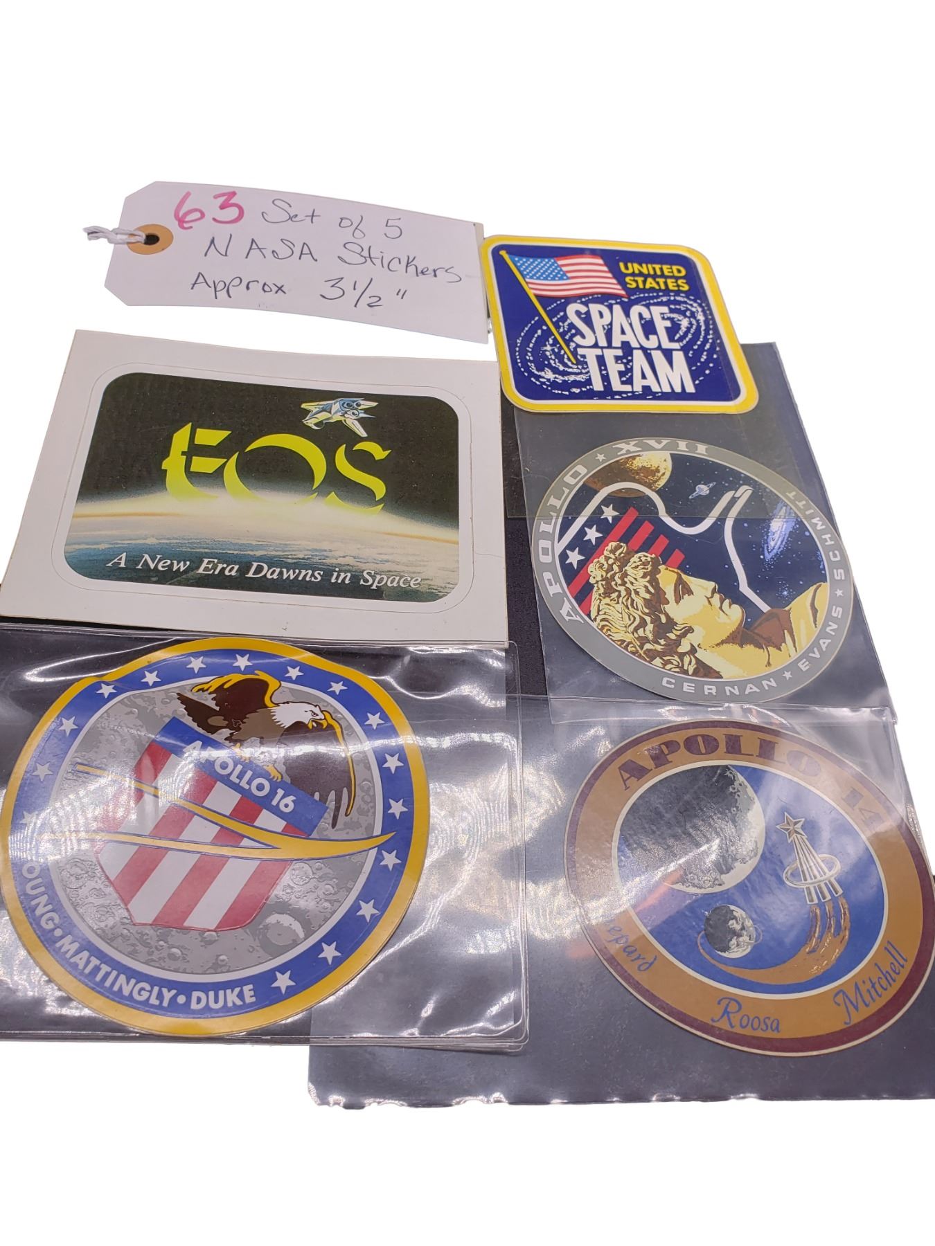 NASA Set of 5 Stickers Piece is approx 3 1/2" All items are from the Estate of Charles Bell space auction in May of 2000 All item for this Auction Located in in Hollywood Florida Warehouse For Shipping Call today for quote they have item numbers and Pak Mail is available for all your custom packaging and shipping needs. We can package, palletize, crate, insure and ship to any Domestic or International location. All packaging and shipping fees must be paid in full before shipment is released. On international shipments, consignee is responsible for all Duties, Taxes, Customs Clearance or any destination fees that apply. Please visit our website @ www.pakmail.com/us770 for contact information or to get a quote. (Let us know you are a winning bidder from the Puckett auction so we can correctly arrange pick up for your item) Telephone number is 954 522 4550 Pak Mail www.pakmail.com/us770 email us770@pakmail.com Monday Friday 9 am to 6pm Sat 10 am 3 pm