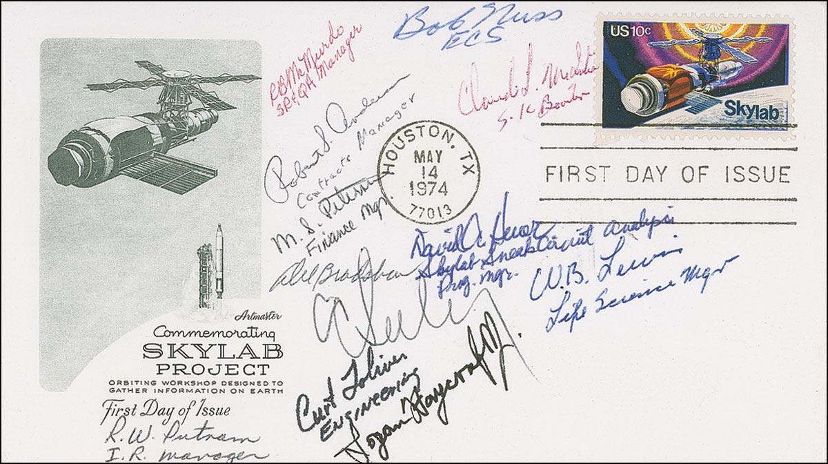 FDC honoring the Skylab Project, signed in various color ink by 12 NASA Skylab personnel: Curt Toliver (Engineering Manager), Logan Haycraft (Safety, Reliability and Quality Dept. Manager), W. B. Lewis (Life Sciences Manager), Bob Nuss (Environmental Control Manager), Bob Anderson (Contracts Manager), R. B. McMurdo (Safety, Reliability and Quality Project Manager), Del Bradshaw (Base Manager), Oliver Seeley (Support Service Manager), R. W. Putnam (Industrial Relations Manager), M. S. Peterson (Finance Manager), David Heuer (Sneak Circuit Analysis Manager), and Claude McIntire (Marketing Manager). In fine condition.