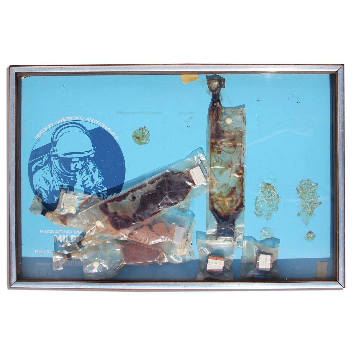Astronaut space food display used for NASA's Apollo moon program. Case was originally created at Milprint, the packaging company which made the flight ready items for NASA. Display features the astronauts' freeze dried food in clear plastic, consisting of four pouches of tuna salad, cream of tomato soup, orange drink with feeding tubes, two smaller packages of cheese cracker cubes and strawberry cereal cubes. The display also includes the image of an astronaut eating one of the pouches. Reads in part ''...Feeding America's Astronauts - Apollo...'' Housed in a wooden and silver display case, measuring 30'' x 20'' x 3''. All the pouches have come loose from the backing, with one tube having lost its seal and nearly evaporated. An interesting collection of 1960's gourmet as envisioned by NASA.
