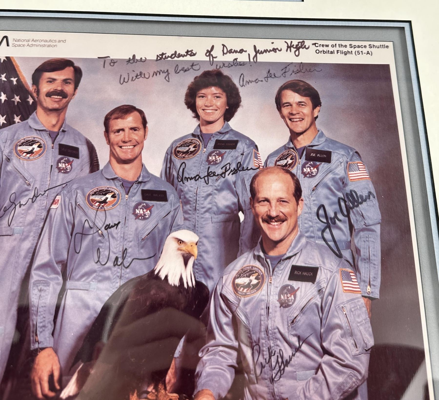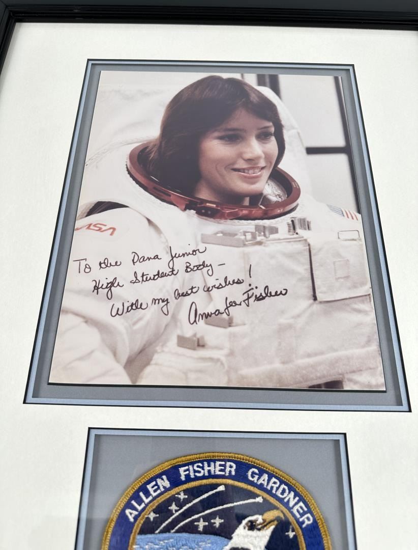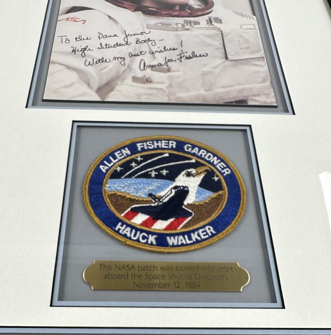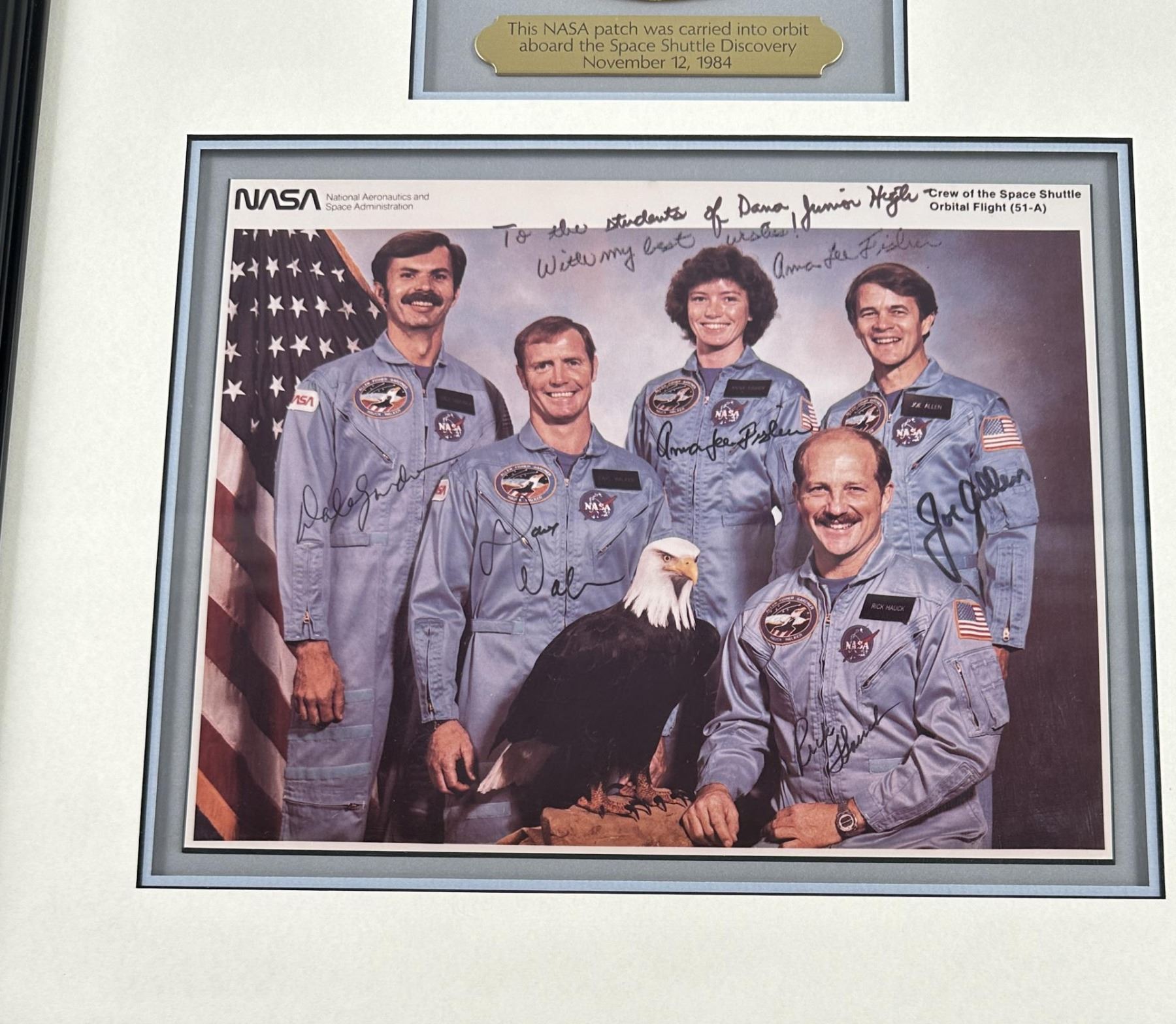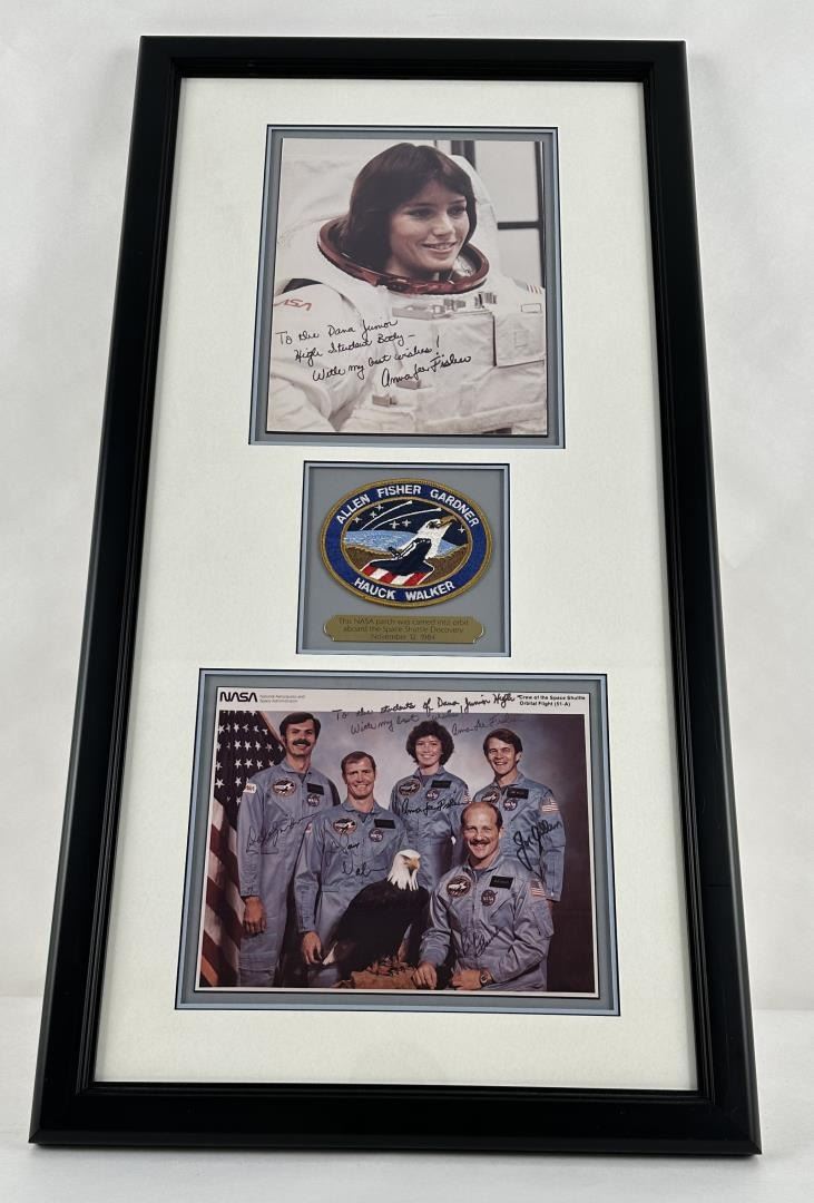 Plaque states that the patch was carried into orbit aboard the Space Shuttle Discovery November 12 1984. Also included is a crew signed photo of the Orbital flight, and a personalized photo signed and inscribed by Anna Lee Fisher. 16 3/4" by 32 1/8" framed.