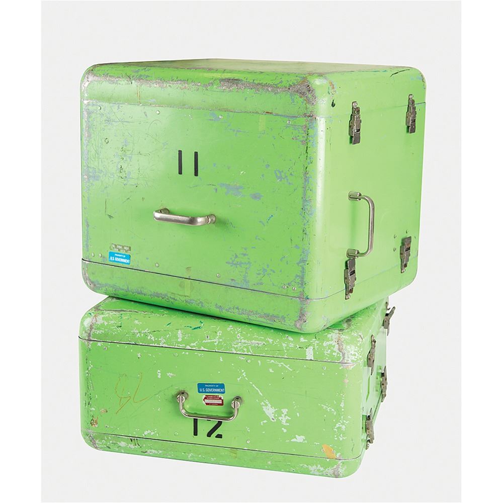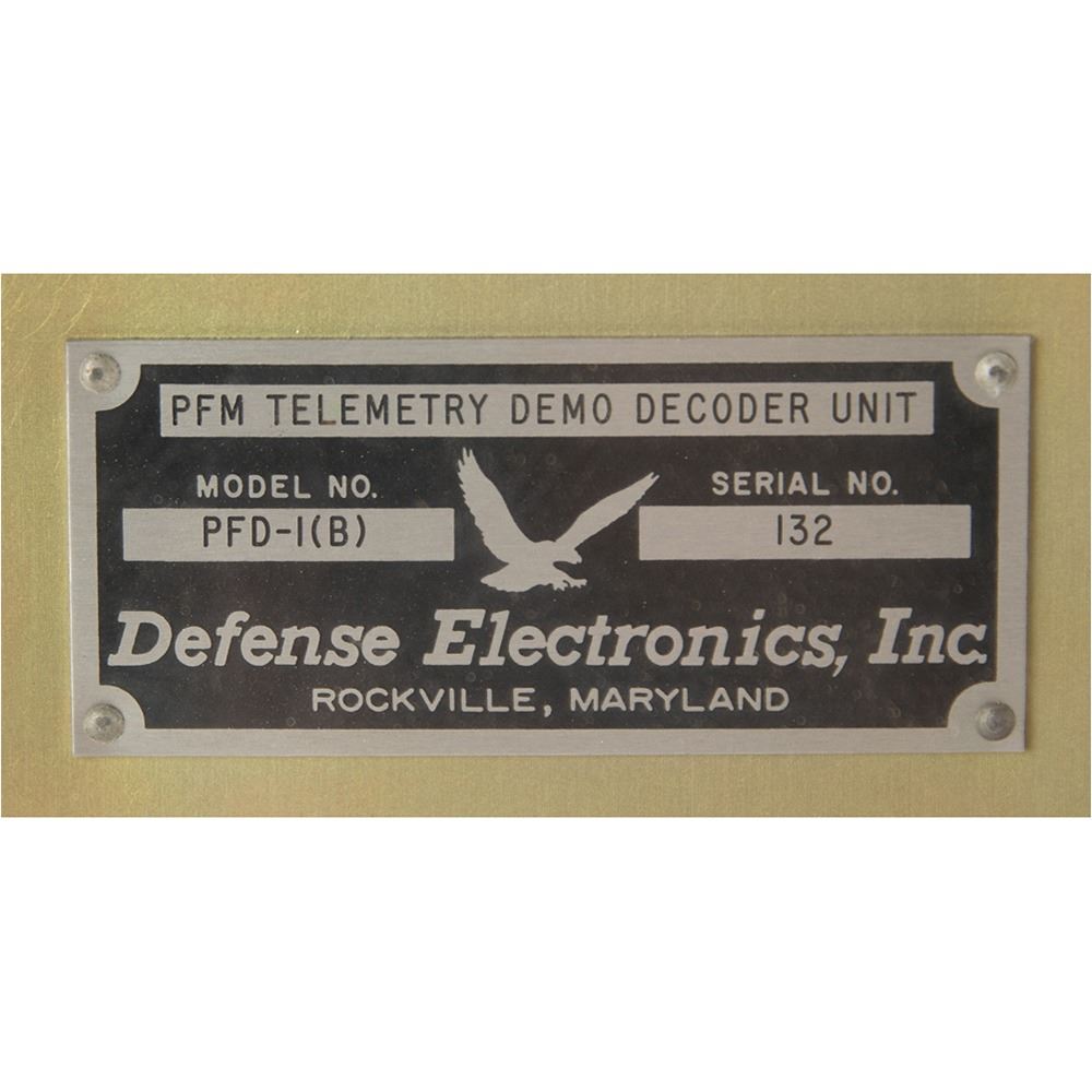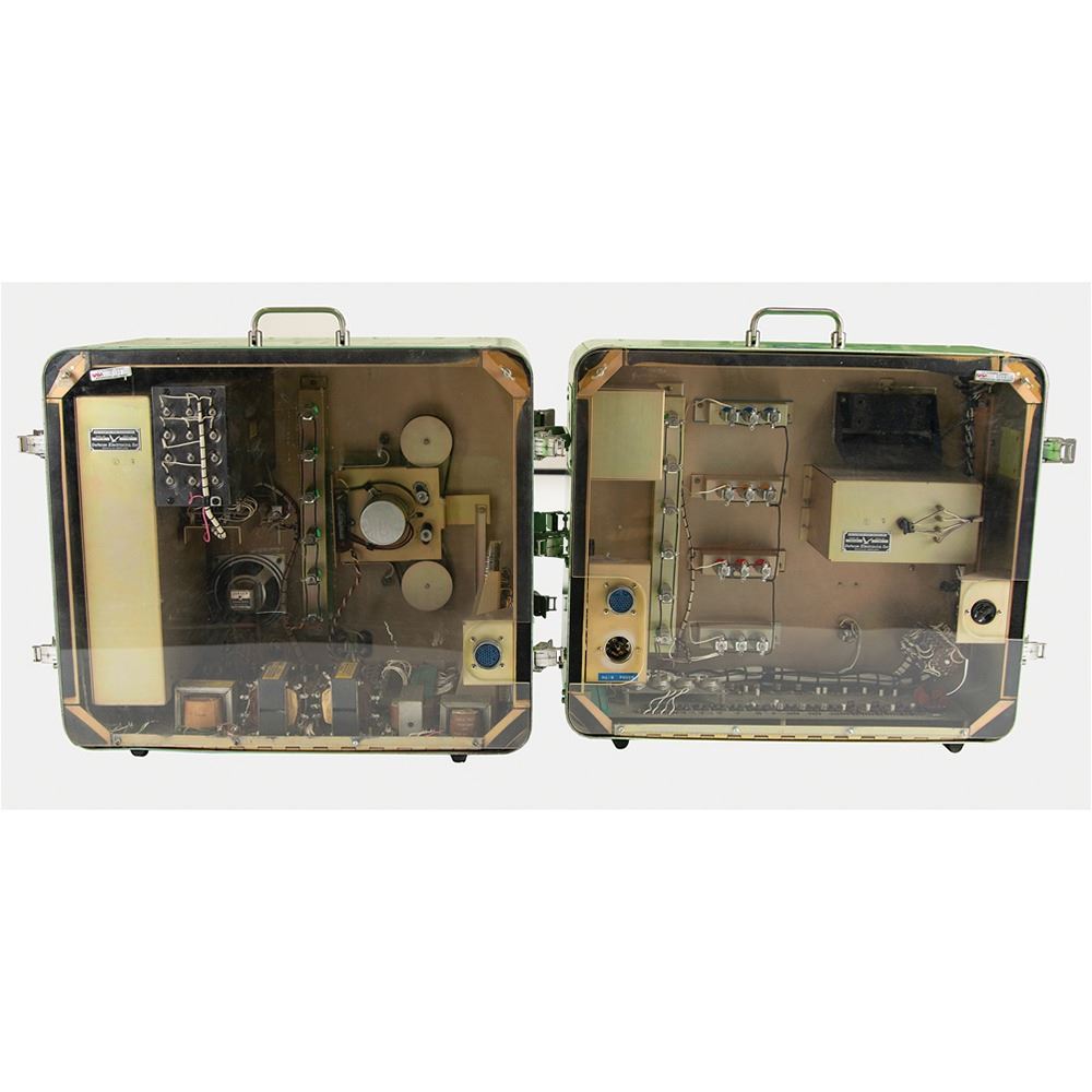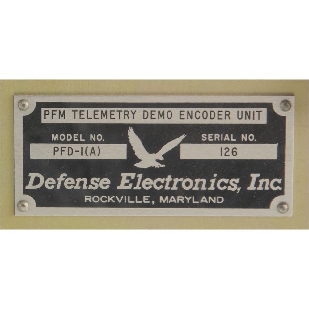 Large NASA telemetry encoder/decoder demonstration unit housed in two large green cases, measuring 21è x 19è x 11è and 18è x 21è x 18è, with control/indicator panels on one side and windows displaying the internal hardware and circuitry on the other. The encoder unit features a meteoroid detector, aspect sensor, temperature sensor, and reference input on the face, with lighted indicators, and a Defense Electronics, Inc. identification plate on the reverse: "PFM Telemetry Demo Encoder Unit, Model No. PFD-11(A), Serial No. 126." The decoder unit has a reel-to-reel tape recorder on the face, with built-in digital readout, binary readout, analog meter, and audio output. The reverse bears a Defense Electronics, Inc. identification plate: "PFM Telemetry Demo Decoder Unit, Model No. PFD-11(B), Serial No. 132." Together, these devices demonstrate the conversion of received telemetry data (data that includes automated remote measurements such as spacecraft health) to a machine/automated readable format. In overall very good to fine condition, with wear to the exterior of the cases.