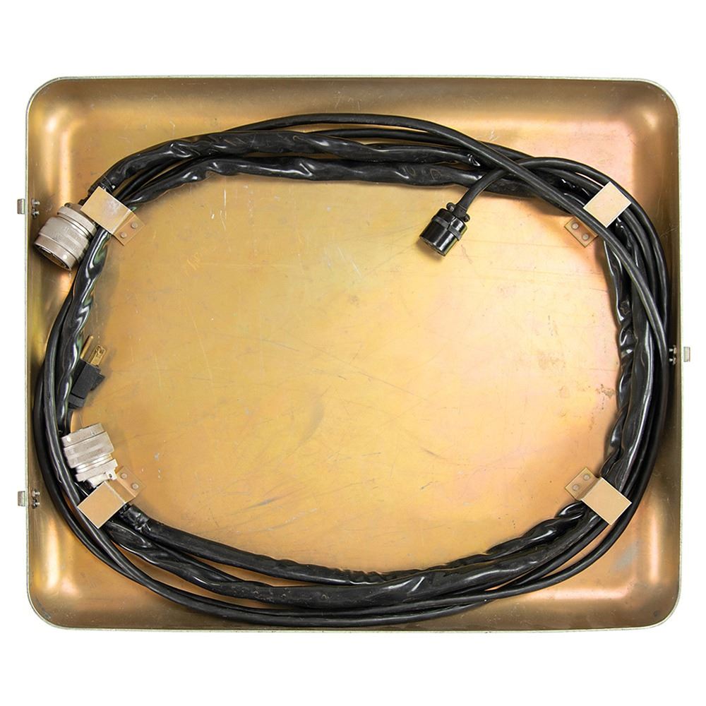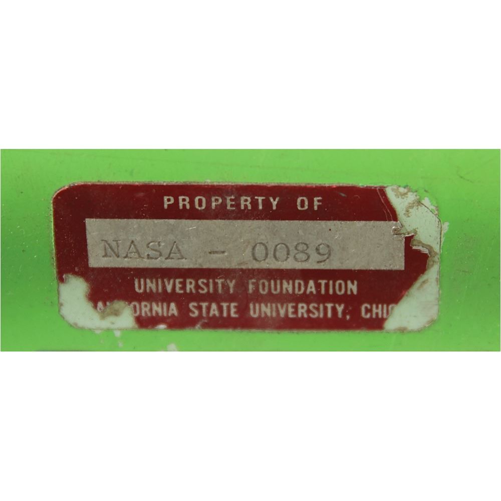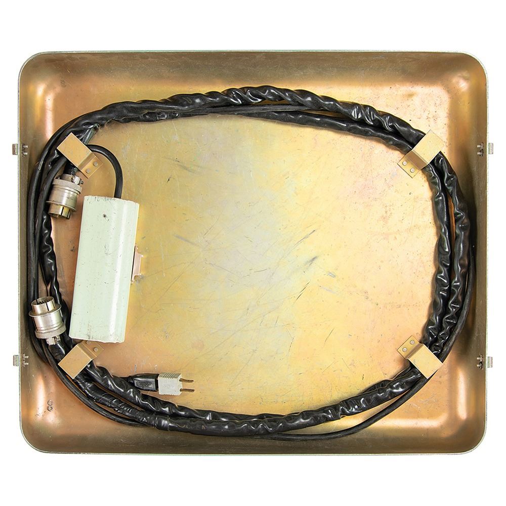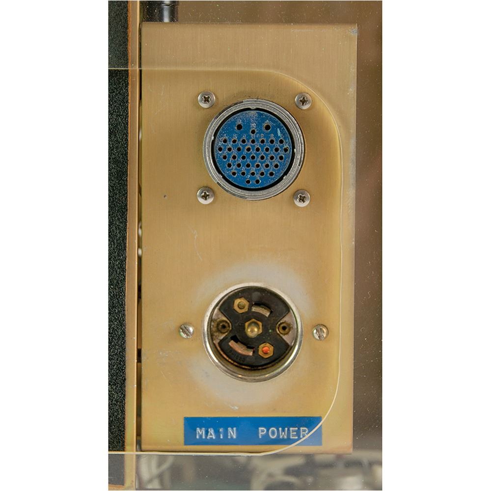Large NASA telemetry encoder/decoder demonstration unit housed in two large green cases, measuring 21è x 19è x 11è and 18è x 21è x 18è, with control/indicator panels on one side and windows displaying the internal hardware and circuitry on the other. The encoder unit features a meteoroid detector, aspect sensor, temperature sensor, and reference input on the face, with lighted indicators, and a Defense Electronics, Inc. identification plate on the reverse: "PFM Telemetry Demo Encoder Unit, Model No. PFD-11(A), Serial No. 126." The decoder unit has a reel-to-reel tape recorder on the face, with built-in digital readout, binary readout, analog meter, and audio output. The reverse bears a Defense Electronics, Inc. identification plate: "PFM Telemetry Demo Decoder Unit, Model No. PFD-11(B), Serial No. 132." Together, these devices demonstrate the conversion of received telemetry data (data that includes automated remote measurements such as spacecraft health) to a machine/automated readable format. In overall very good to fine condition, with wear to the exterior of the cases.