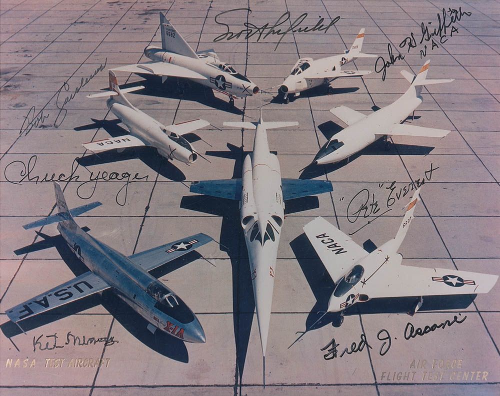 Color glossy 10 x 8 photo of seven planes on a tarmac, signed in black felt tip by pilots Scott Crossfield, Chuck Yeager, Bob Cardenas, John Griffith, Kit Murray, Pete Everest, and Fred Ascani, each signing next to the respective aircraft they flew. In fine condition.