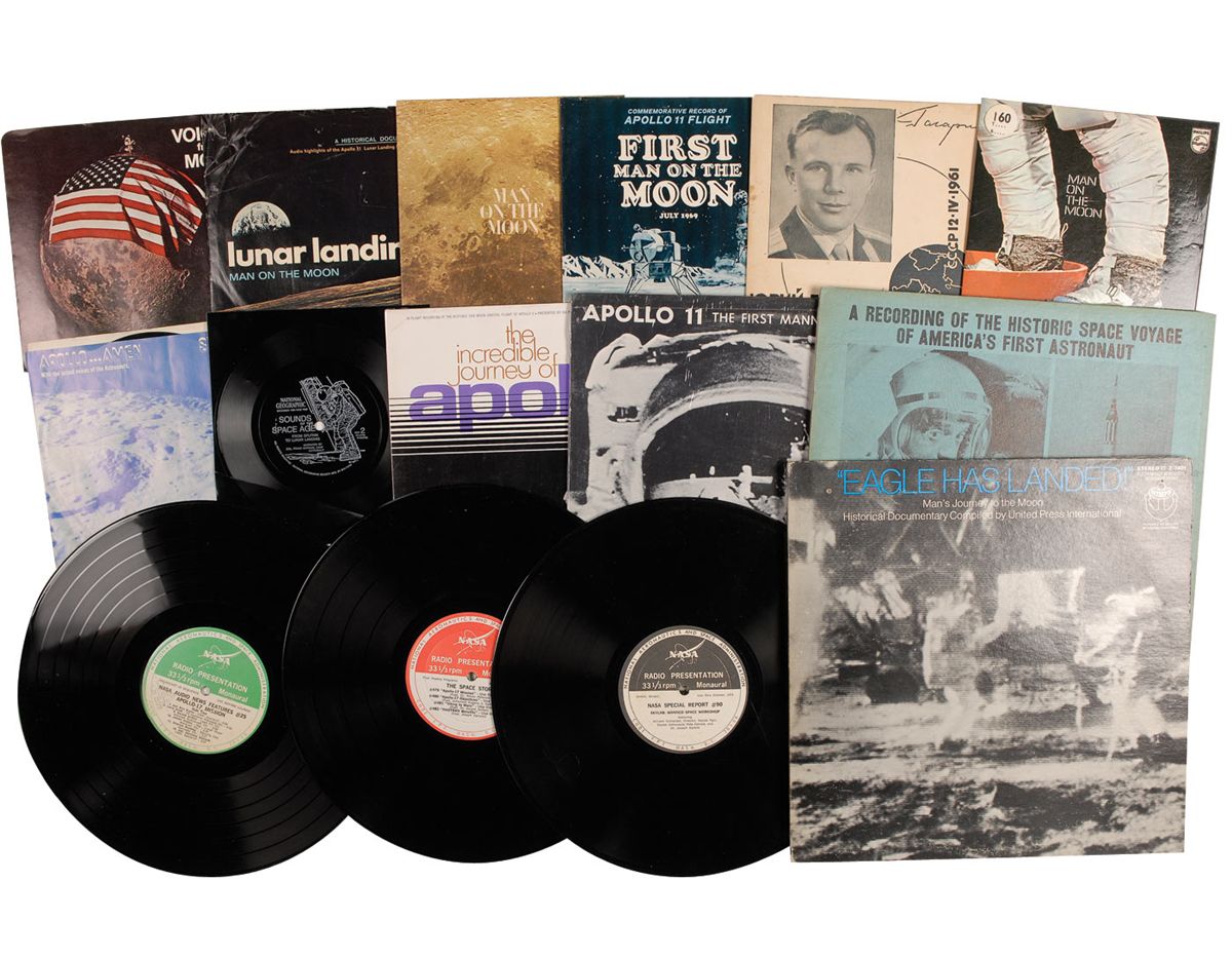Fifteen items: Three NASA-issued single-sided 33 1/3 rpm radio presentation records, each with weekly reports on different Apollo projects. Records are titled: “The Space Story,” “NASA Audio News Features #25 Apollo 17 Mission,” and “NASA Special Report #90, Skylab: Manned Space Workshop.” Albums come in blank sleeves with no covers present; four space-related 33 1/3 rpm albums: Apollo 11: The First Manned Lunar Expedition, ‘Eagle Has Landed’ Man’s Journey to the Moon, A Recording of the Historic Space Voyage of America’s First Astronaut, and The Incredible Journey of Apollo 8; and Eight smaller space-related albums, both 33 1/3 and 45 rpm: Lunar Landing on the Moon, Man on the Moon, National Geographic’s Sounds of the Space Age, First Man on the Moon, Apollo…Amen by Street, Voices From the Moon, Man on the Moon, and a Russian album commemorating Yuri Gagarin’s 1961 flight. In very good condition, with expected cover wear, scattered creasing and toning, and a few edge separations.