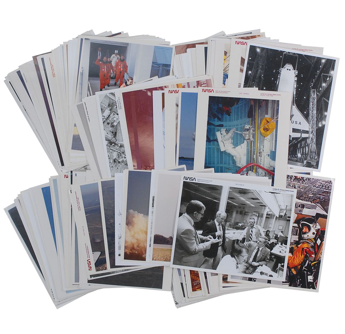 Over 250 official NASA photos from the Space Shuttle program, 8 x 10 and 10 x 8, various finishes. Images include crew photos, training, lift-off and landing, and launch prep. Highlights include: the Discovery in its lifting sling; the arrival of Challenger to the Orbiter Processing Facility; post-flight inspection of Columbia’s tiles; various payloads; launches and landings; and certain emergency and firefighting procedures. In overall fine condition.
