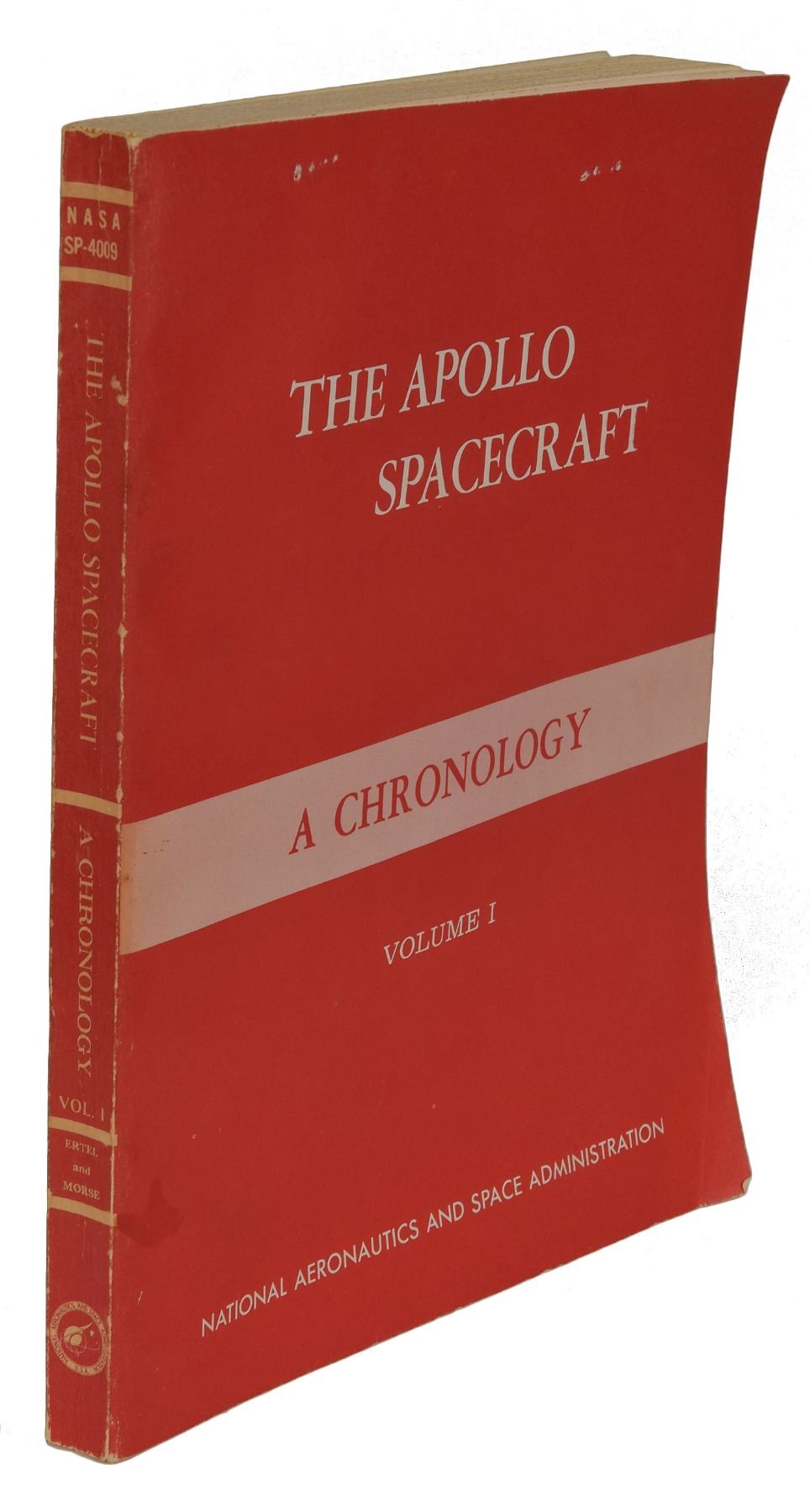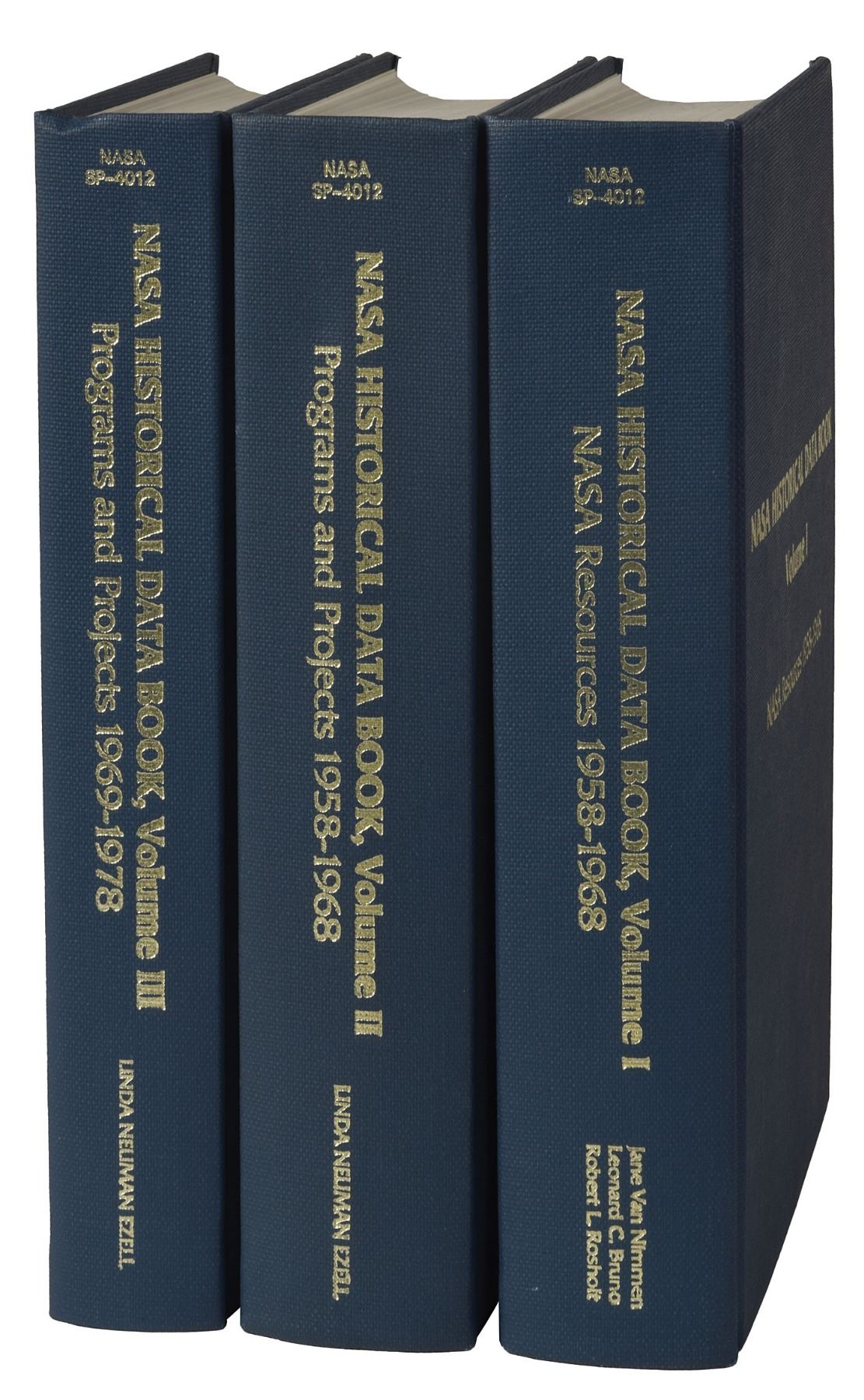 Unsigned books: a softcover copy of The Apollo Spacecraft: A Chronology, Volume I (SP-4009), published by NASA in 1969; a hardcover copy of Stages to Saturn (SP-4206), published by NASA in 1980; and a set of three hardcover NASA Historical Data Books, Volumes I–III (SP-4012), published by NASA in 1988. In overall very good to fine condition, with wear and soiling to covers of the softcover book.