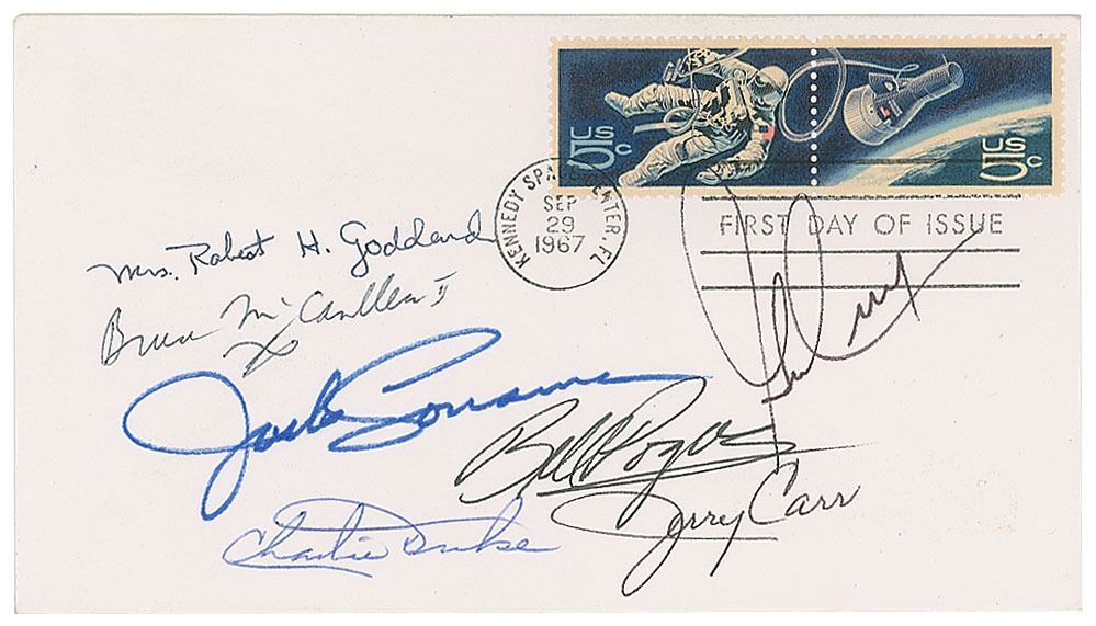 FDC bearing the 1967 Gemini Twin Space stamps, postmarked on the issue date of September 29, 1967, signed in various ink types by Gene Cernan, Charlie Duke, Bruce McCandless, Jack Lousma, Bill Pogue, Jerry Carr, and the widow of Robert Goddard, Esther Christine Kisk. In fine condition.