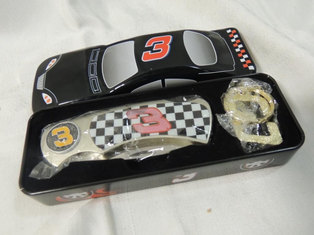 NASCAR DALE EARNHARDT #3 POCKET KNIFE RACING LOCK BACK NASCAR FOLDING KNIFE IN COLLECTORS TIN NUMBER 8 PANEL ON BOTH SIDES COMES IN A METAL DISPLAY CASE BLADE LENGTH 3-1/2" BLADE THICKNESS 1/16" AND ALMOST 1" WIDE CLOSED LENGTH: 4-1/2" BLADE MATERIAL STAINLESS STEEL. AS SHOWN SEE PHOTO FOR MORE DETAILS.
