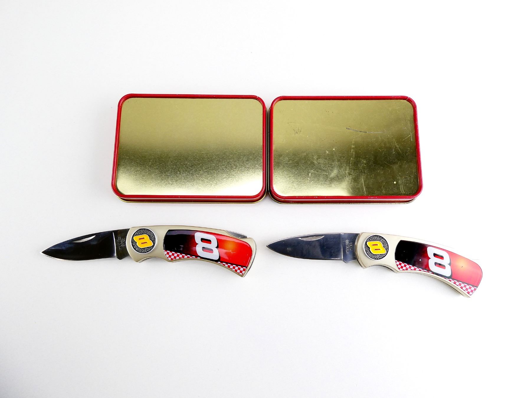 LOT INCLUDES; (2) DALE EARNHARDT JR. FOLDING KNIVES, STAINLESS STEEL BLADE, MARKED: "CHINA", WITH POLYMER HANDLES, HANDLES MARKED: "8", WITH COLLECTABLE DISPLAY TIN, BLADE OAL 3", TIN APPROX 5" X 3.5" X 1". SEE PHOTOS.