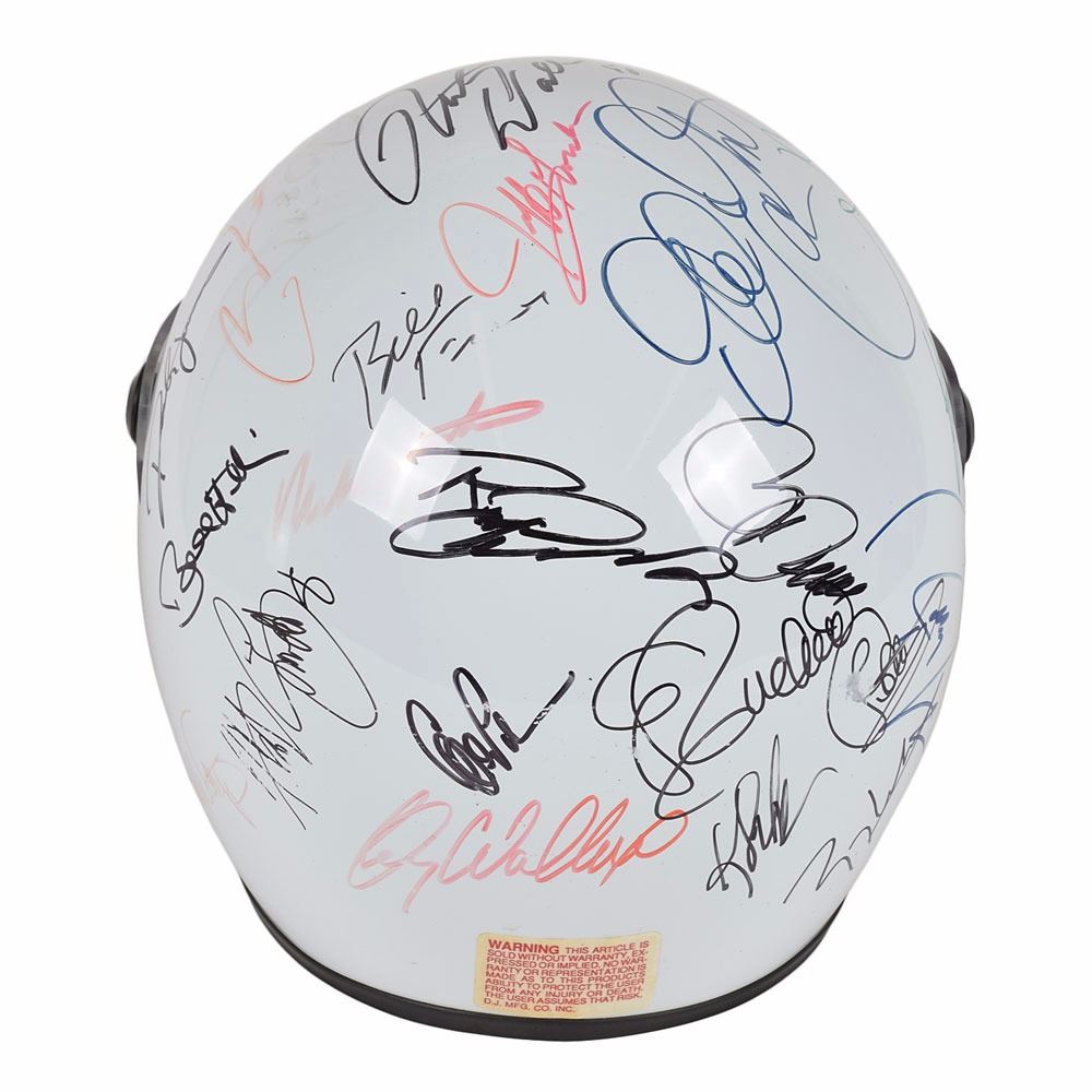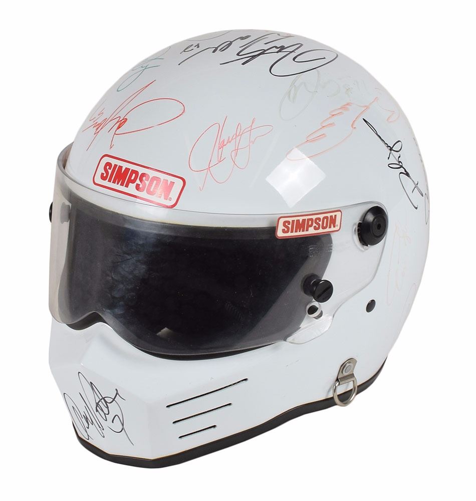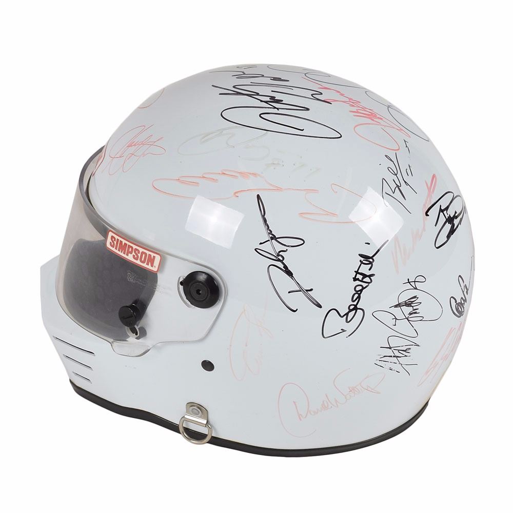 White 1997 Simpson NASCAR racing helmet signed by 27 motorsport superstars, including: Dale Earnhardt, Sr., Jeff Gordon, Rusty Wallace, Terry Labonte, Felix Sabatts, Bobby Hillon, Morgan Shepard, Mark Martin, Geoff Bodine, Hut Striklin, Bobby Labonte, Greg Sacks, Darrell Waltrip, Ernie Irvin, Richard Petty, Harry Garet, Ray Childress, Buddy Baker, Greg Penske, Bill Fram, Jr., Chad Little, Bill Elliot, Dick Trickle, Kenny Wallace, Kyle Petty, and Robby Gordon. In fine condition, with fading to some of the signatures. Accompanied by color copy photos of many of the drivers signing the item. Dale Earnhardt, Sr.'s signature is especially large and bold on the top of the helmet.