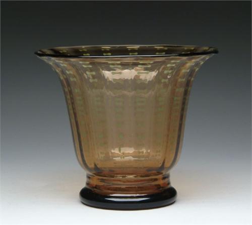 NASH VASE. Wonderful dark amber vase has olive green vertical zipper pattern surrounding the vase. Vase is unsigned, but attributed to Nash. SIZE: 6 in. t. CONDITION: Very good to excellent. 5-61312