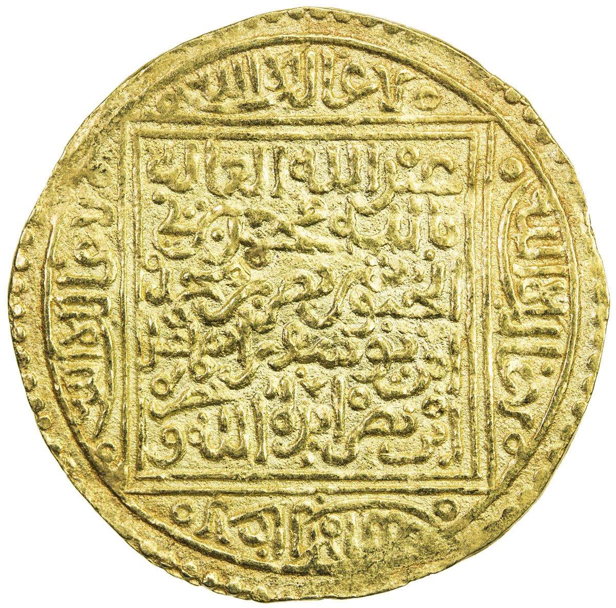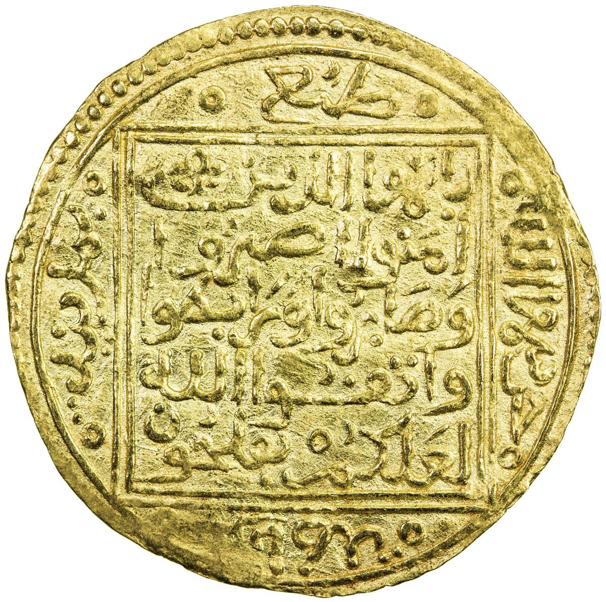 NASRID OF GRANADA: Muhammad IX, several periods between 1419 and 1453, AV dinar (4.69g), Gharnata, ND, A-412, ruler cited as 'abd Allah al-ghalib billah muhammad bin abu'l-juyush b. nasr…, excellent strike, EF, RR.