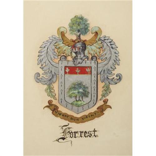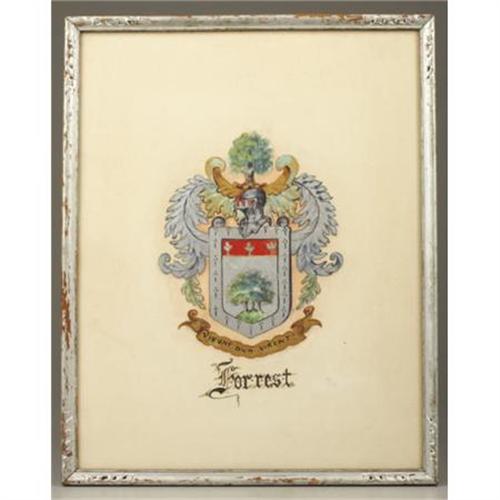 <B>NATHAN BEDFORD FORREST HAND DRAWN FAMILY CREST "COAT OF ARMS"</B></I> <B> </B></I>- Spelling variations of this family name include Forrester, Forester, Forrest, Forster, Foster, Forrestor, Etc. First found in Northumberrland where they were seated from very ancient times, some say well before the Norman Conquest and arrival of Duke William at Hastings in 1066 A. D. Some of the first settlers of this family name or some of its variants were: James Forest, who settled in Virginia 1i 1654. From the county records of Orange County, N.C. and from family Bible record, we believe this William Forrest to be the William Forrest who later appeared in Orange County, N.C. The Orange County William was born in 1726 and died in 1778. This William Forrest is the father of Shadrack, who is said to have come from Virginia to Orange County, N.C. It is possible that Shadrack came with his father, William, down the valley of Virginia from Pennsylvania to Orange County, N.C., though this is not known definitely. However, it is definitely known that Shadrack had a son, Nathan, who was born in Orange County, N.C. but who emigrated to Tennessee where his son, William, was born. William married Mariam Hook and to them was born July 13, 1821, Nathan Bedford Forrest who later became one of the greatest generals of the Confederate Army. While no definite proof that William Forrest of Orange County, N.C. and William of Chester County, PA are the same, the circumstantial evidence is very strong. The older members of the Forrest family have been told by their parents that they were cousins of General Forrest and General Forrest coming from Orange County, N.C. seems definitely to indicate relationship. This beautiful hand drawn <I>“Forrest”</B></I> family crest, in frame 11” x 15”, depicts the coat of arms of this famous General. <BR><BR><B>Provenance:</B></I> <I>Forrest Family at the same time they sold the silver servic.</B></I><BR><B>Exhibited:</B></I> <I>Lot 2 House Museum, Franklin, Tennessee. </B></I><BR><B>Condition:</B></I> Very fine <BR><BR><b>Shipping:</b> Framed - without Glass, Small (<a target="_blank" href="http://www.heritageauctions.com/common/shipping.php">view shipping information</a>)