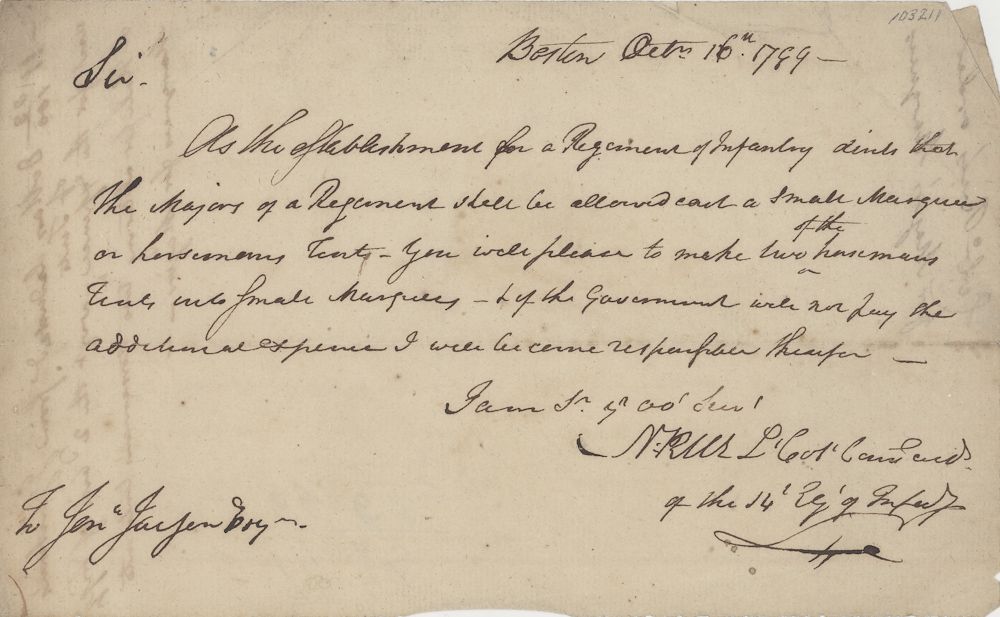 (1754 - 1834) Massachusetts officer, aide-de-camp to Gen. Benjamin Lincoln from 1777 to 1780. Second in command to Alexander Scammell at Yorktown and commanded the light infantry after Scammell was killed. Military-content A.L.S., 1p. oblong 8vo., Boston, Oct. 16, 1789, and writes, in part: "As the establishment for a Regiment of Infantry directs that the Majors of a Regiment shall be allowed each a small Marquee or horseman's Tent - You will please to make two of the horsemans Tents into small Marquees ..." Light folds and soiling, else very good.