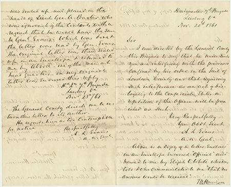 An intriguing exchange of letters between C.S.A. Gen. Nathan "Shanks" Evans and Loudoun County attorney and slave owner Matthew Harrison (1822-1875), an apparent dispute between Evans and Harrison in which Harrison got the CSA Secretary of War involved, dissolved into Evans' accusing Harrison with disloyalty by interfering in the general's business. Following his celebrated success at First Bull Run, Evans was placed in command of the critical Northern Virginia region surrounding Leesburg. His position was not an envious one: Leesburg and her citizens had many ties to family and friends living to the north in Maryland and elsewhere. When visiting the region civilians came and went at their own discretion and where not concerned with local military protocol. To keep a handle on this activity, Evans jailed some and questioned others. His actions, even though correct under military law, angered some including Attorney Harrison. As a consequence, Evans was lambasted by Harrison to top Confederate authorities as the following letters reveal. Both letters are in Attorney Harrison's hand and are written to Lt. Col. Charles B. Tebbs, of the 8th Virginia Infantry, with the original transmittal cover, outlining the dispute between "Shanks" Evans and Harrison. The cover letter, 2pp., 8vo., Richmond, Va., Dec. 19, 1861 reads in small part: "…I have been intending to send you a copy of the correspondence between Evans & myself and I avail myself of the opportunity...[it] will probably annoy you & the officers of the 8th…I reported Evans' conduct to the Secty of War. He [Evans] received a letter from the War Department on the 20th November…he won't allude to the letter from the Secretary, but tries to change the issue with me by writing an indirect letter to me about my having acted as counsel for the prisoners confined in jail. His whole conduct was as I characterized it is stupidly malicious…I would like[possibly Maj. Thomas Green] Peyton to see the correspondence as he would enjoy it…". Included here is Harrison's, 4pp. 8vo., copy of the angry exchange, reading, in part: "Headquarters 7th Brigade, Leesburg, Va., Nov. 20, 1861. Sir, I am directed by the general Comdg. this Brigade to say that he understands you are interfering with the prisoners confined by his orders in the jail of Loudon County and that regarding such interference as an act of disloyalty to the Confederate States a repetition of the offense will be punished as such. Very Respectfully…A. L. Evans a. a. Genl. Above is a copy of a letter…endorsed 'official' and handed me by Elijah V. White [Evans' aide] who was told & who communicated to me 'that no answer would be received.'The following is a copy of my reply. Leesburg, Nov. 21, 1861. Sir, Your letter of the 20th inst. was handed to me today by Mr. Elijah V. White and I have to say…that the charge that I have interfered in any illegal, improper or disloyal manner with prisoners confined by your order…is false and had no shadow of foundation, but in the malicious stupidity of its author…I have acted in counsel when requested to do so for…my fellow citizens as I have believed to be peaceable, loyal men unlawfully detained in custody and have endeavored to aid them in their vindication…of their constitutional rights…rights which you have disregarded and trampled upon…I shall continue…to act whenever the abuse of power on the part of those clothed with their 'brief authority' shall render such action necessary or proper. Your threat 'that regarding such interference as an act of disloyalty to the Confederate States'…is but contemptible gasconade and any effort to carry it into execution will be met as it deserves…I know your rights and shall respect them. I know my own and those of my fellow citizens and shall maintain them and before the 'majesty of the law' you may soon be taught that even 'your majesty' must bow…the letter…was sealed up and placed in the hands of Lieut. Geo. A. Baxter who was ignorant of the contents with a request that he would hand the same to Genl. Evans…the original letter was…endorsed…Hd. Qrs., 7th Brigade, Leesburg, Va., Nov. 23, 1861. The General Comdg. directs me to return this letter to its author. He regards him as too contemptible for notice. Respectfully, A. L. Evans a. a. genl…". In reality, it appears, Evans was abusive of his power. In fact, later in the war he was accused of drunkenness and of being abusive to his superiors. It seems from this exchange of letters that Evans blindly and illegally imprisoned innocent Leesburg citizens because of a huge ego - at least he certainly overstepped his authority. Governor Letcher's relieved Evans of duty in early December, 1861 and replaced him with Gen. D. H. Hill. Perhaps Evans accused Harrison of interference in order to cover up his own errant actions....