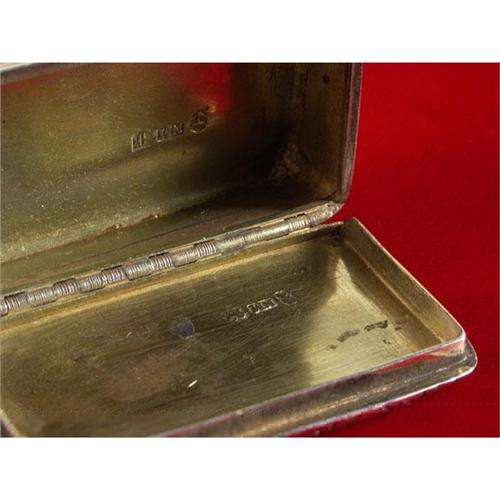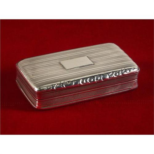 STERLING SILVER: A sterling silver snuffbox, ribbed surface, 2.75'' x 1.5'', hallmarked on both lid and box interiors ''anchor and lion passant, Birmingham 1828'', (George IV) ''by ''the famous maker of fine boxes and vinaigrettes.Nathanial Mills''. Note: no dents, interior surface wear commensurate with age.