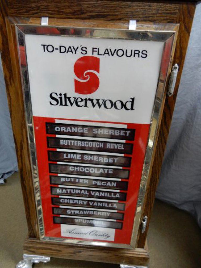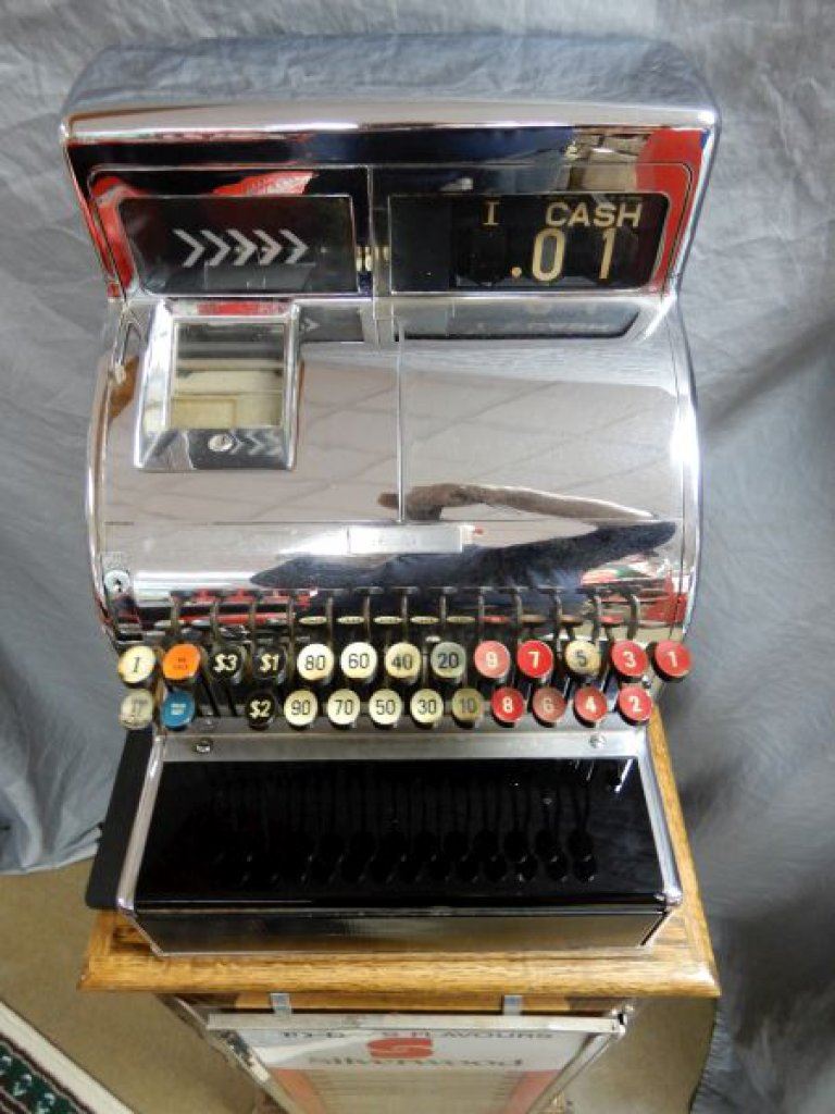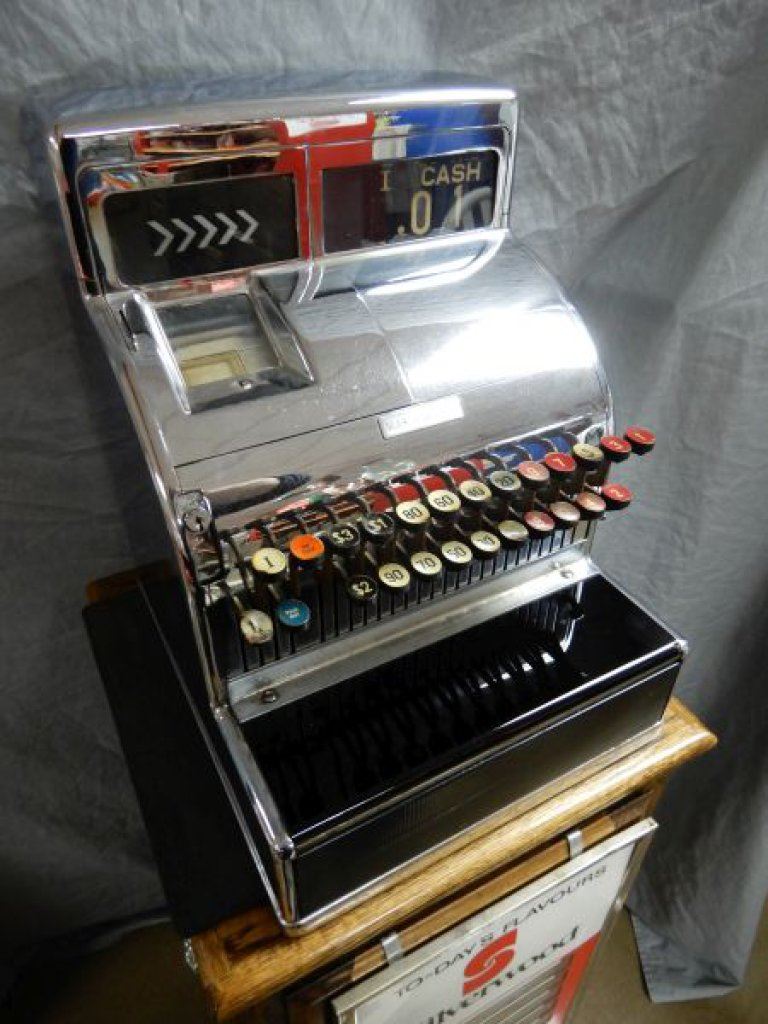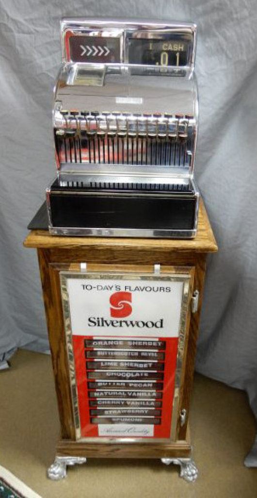 NATIONAL CASH REGISTER WITH CLAWFOOT CABINET WORKING - CABINET HAS KEY - SILVERWOODS TODAYS FLAVOURS ON CABINET FRONT - 17 1/4" X 17 1/4" X 52" LOCATION: SODA SHOP