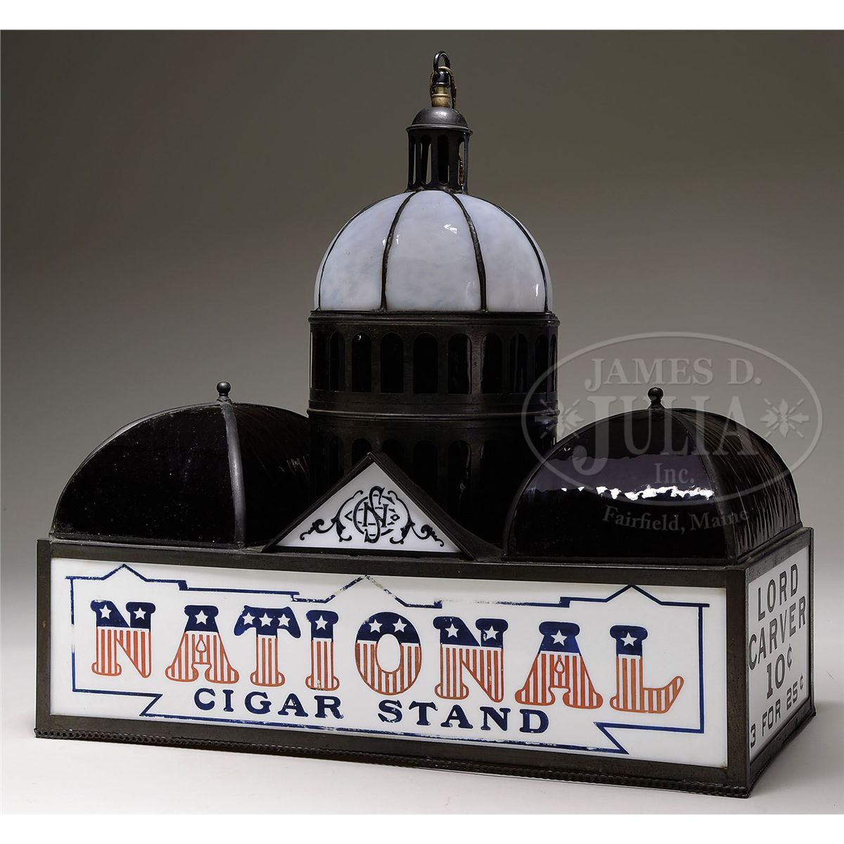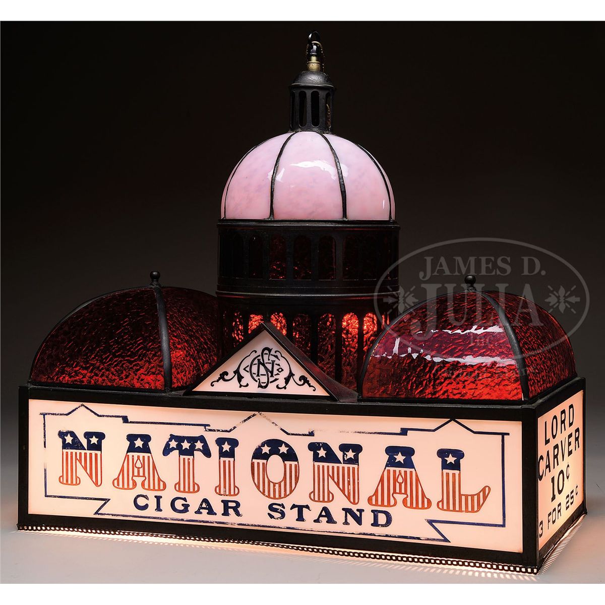 Unique stained glass light in the form of the U.S. Capitol Building, constructed using milk glass and stained glass, and displays a variety of cigar ads. Both front and rear milk glass panels feature debossed lettering in blue, red stripes and white stars which reads "National Cigar Stand". Milk glass side panels read "Black and White 5 Cent Cigar" and "Lord Carver 10 Cents 3 for 25 Cents". The Capitol dome is made with leaded opalescent and ruby glass while the two lower domes are made with ruby glass. Light appears to retain its original electrical fixture. Manufactured circa 1910. SIZE: 23" w x 21-1/2" t x 11" d. CONDITION: Very good to excellent; bottom brass chain-link border is loose and missing original glass beaded fringe; some remnants of fringe are included. One opalescent dome panel has multiple cracks. Threaded hanging rod assembly has been modified or possibly replaced. Porcelain light sockets appear original but have been rewired. 1-13420