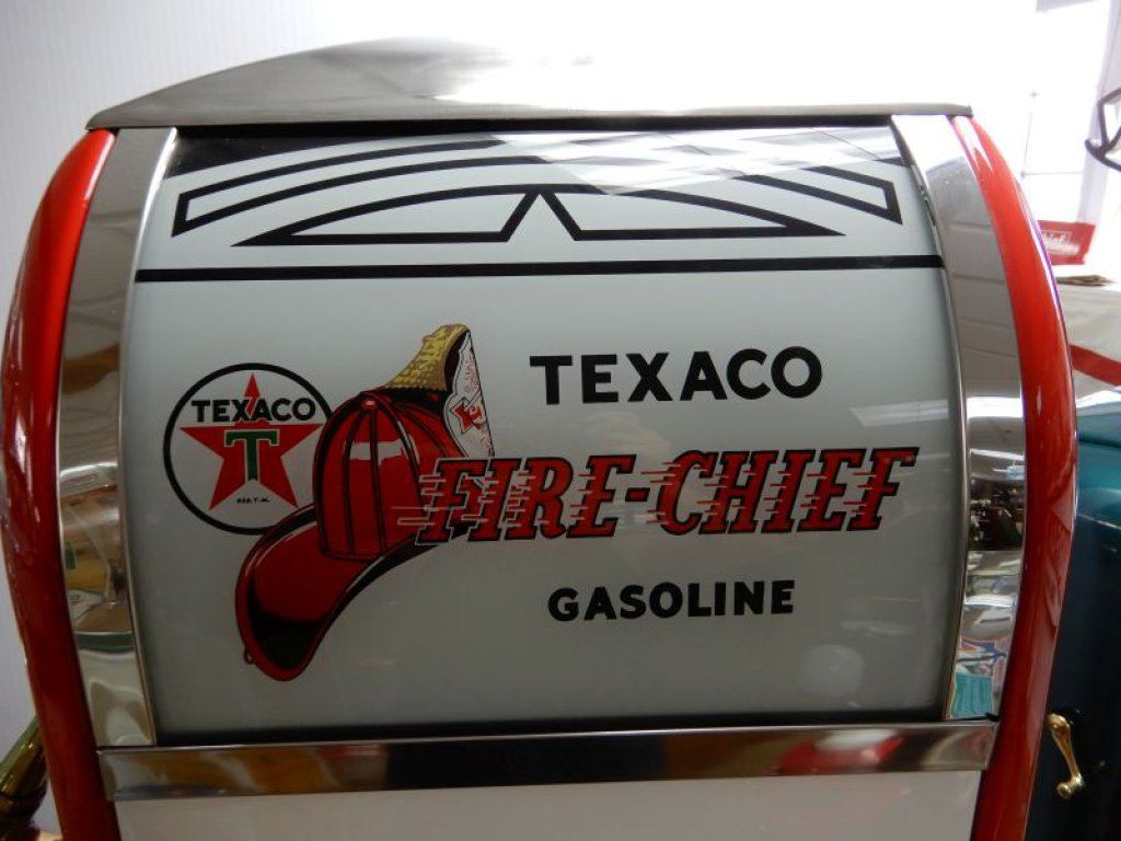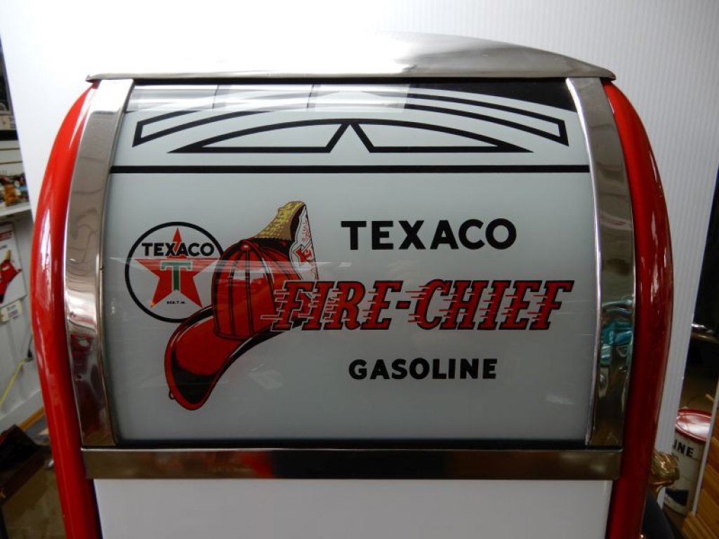 NATIONAL MODEL A38 GAS PUMP PROFESSIONALLY RESTORED TO TEXACO FIRE CHIEF - BRASS NOZZEL - CONVEX AD GLASS - LIGHTS UP LOCATION: LOWER RIGHT