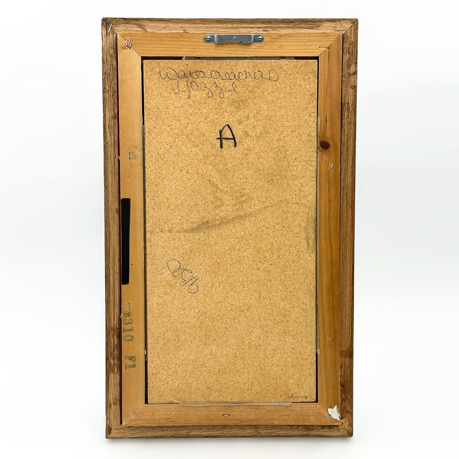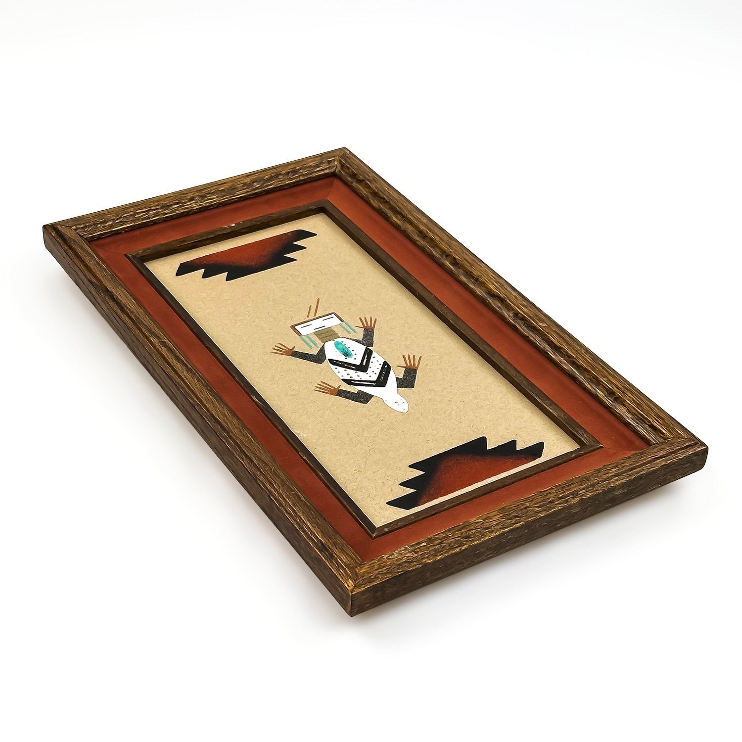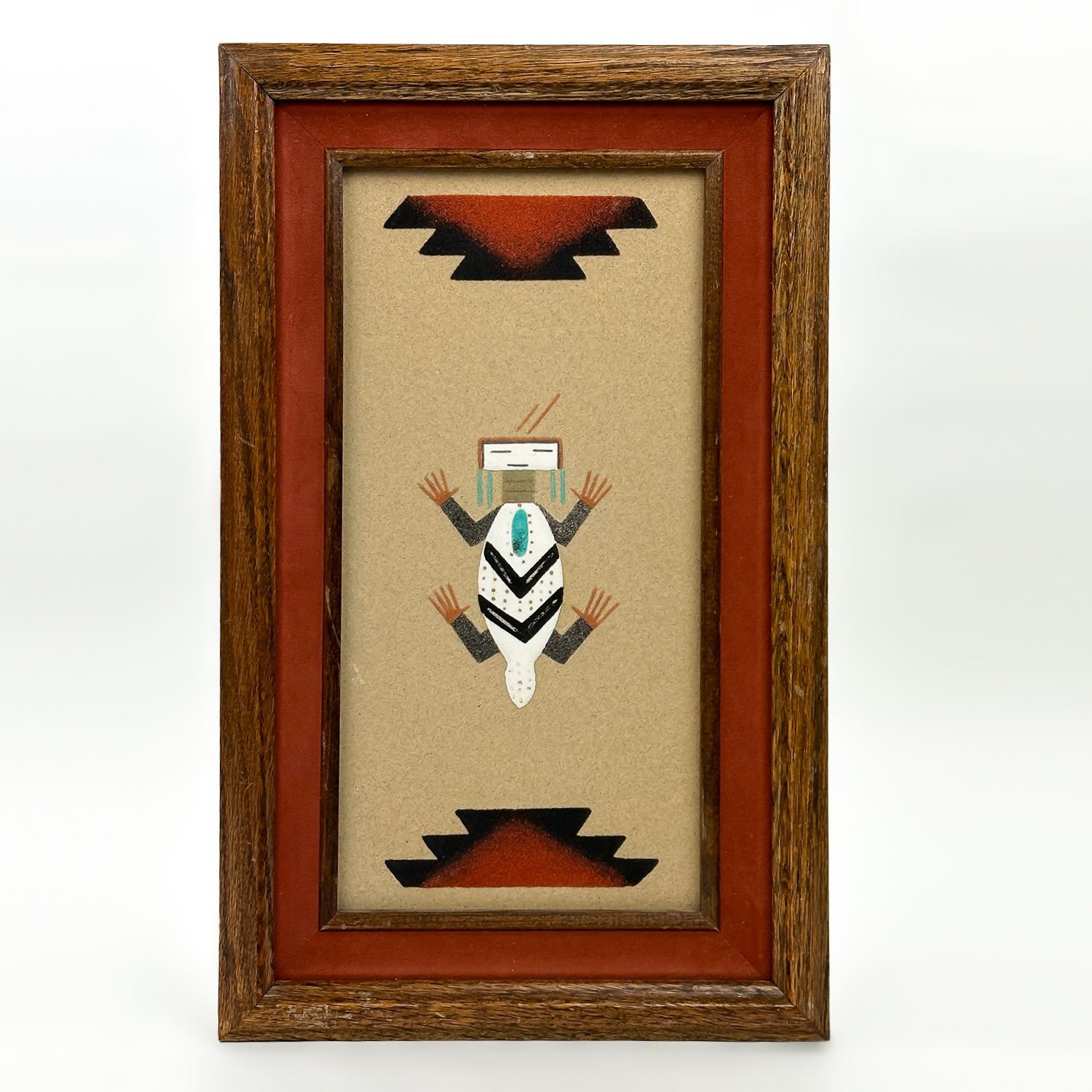 #8970 - NATIVE AMERICAN NAVAJO SAND PAINTING - TITLE: WATER CREACHERS YAZZIE. FRAME MEASURES: 15” (38 CM) HIGH BY 9” (23 CM) WIDE. IMAGE AREA IS: 11.5” (29 CM) HIGH BY 5.25” (13.5 CM) WIDE***ITEM(S) LOCATED IN LETHBRIDGE ALBERTA. FREE TRANSPORT TO EDMONTON OFFICE AVAILABLE FOR THIS AUCTION. WORLDWIDE SHIPPING IS AVAILABLE FOR ALL ITEMS