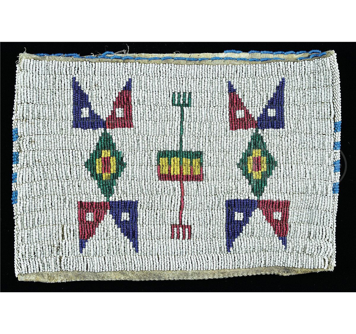 Geometric pattern on a white ground in colors of cobalt, red, green, and yellow. One side decorated, the other not. SIZE: 6-1/2" x 9-1/2". CONDITION: Beadwork intact, possibly fashioned from a larger piece. 9-90010