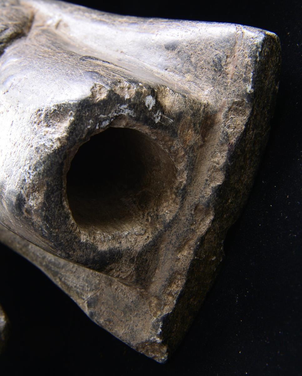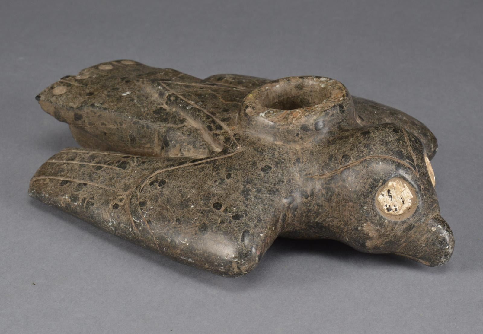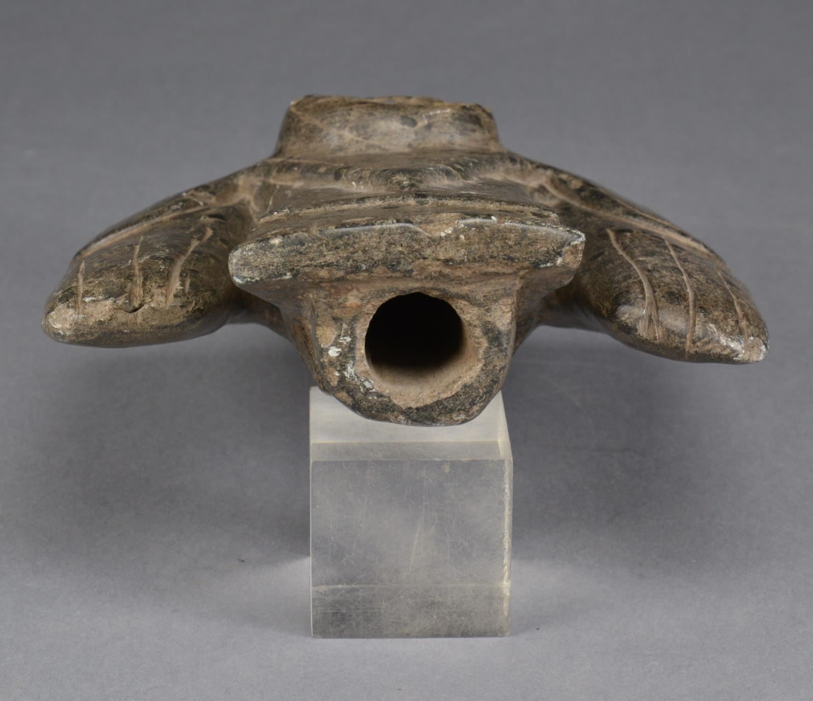 Lg. steatite or claystone bird of prey pipes are most often found in the context of Mississippian ceremonial centers. The symbolism of these lg. pipes relate to the everyday activities of a hunter gatherer society. Pipes like this have been found in ceremonial complexes of the Mississippian culture from Georgia to Ohio & as far west as Tennessee. Generally, these pipes are dated from the 11th century to the 13th century. This pipe has not been dated by an expert in Native American culture through scientific means. Pipe measures approx. 11 1/2” x 8 1/4". The bowl diameter is approx. 1 3/4". The stem is fully drilled through. The material appears to be a gray/green steatite. The eyes have been whitened possibly w/ a clay material. CONDITION: there is notable wear around the edge of the bowl including some chipping. The rear of the tail & wings also show many sm. chips. (02-14016/BF). $1,000-2,000.