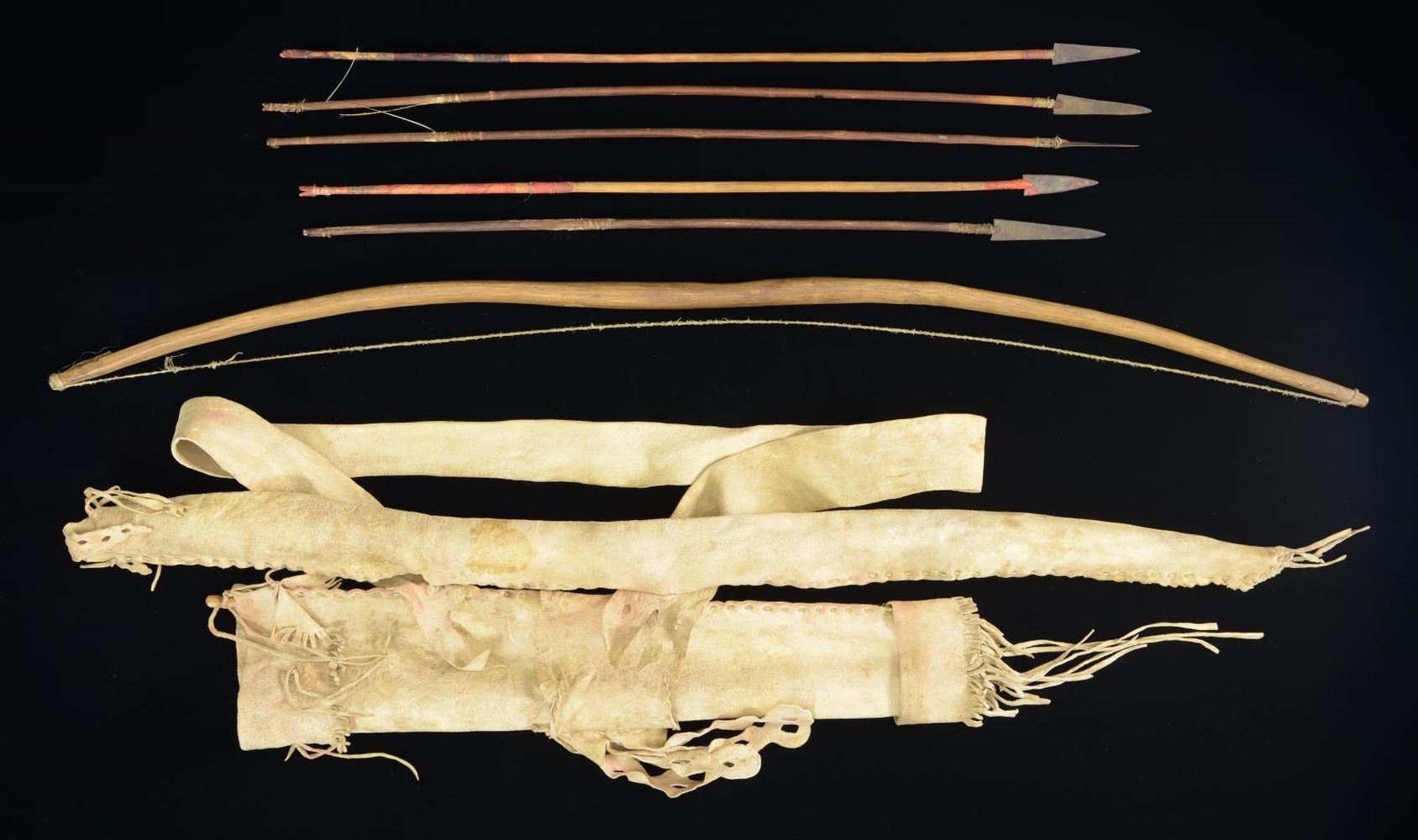 POUCH. 5 - 26" arrows with metal tips plus 42" sinew strung bow pictured and described on page 204 in "THE FUR TRADE." by Author Milton von Damm: "plain leather quiver with separate pockets for the bow and arrows and is a Southwestern style, possibly Apache. It contains arrows with metal tips". CONDITION: good overall; arrows have lost feathers. PROVENANCE: Lifelong Collection of author Milton Von Damm. (02-22246/JS). $600-800.