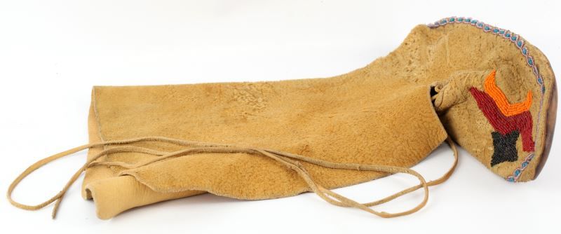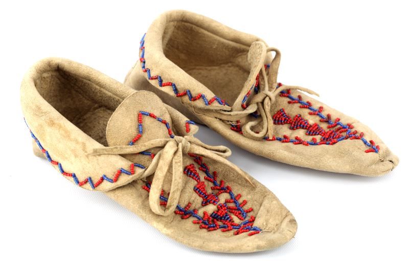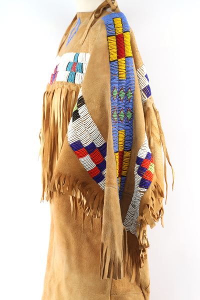 Handmade tanned buckskin women's dress of the Plains Indian, made with suede side out, leather fringe and tassels, ornate beading all in tact. Measures 46 inches by 55 inches. Overall condition is good, there is some wearing to leather and minor holes in the lower section of the dress, there are several intentional markings in three areas at the seams. There are several areas of repair on point. Included are two pair of handmade beaded leather moccasins, size small. One tall pair and one ankle length.