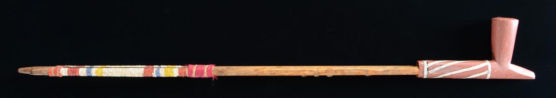 DECORATED STEM. 28" overall, flat pipe stem decorated with small tacks & wrapped dyed red, blue, white, and yellow dyed quill and red trade cloth. Pictured on page 229 of Milton von Damm's "The Fur Trade". CONDITION: very good overall. PROVENANCE: Lifelong Collection of author Milton Von Damm. (02-22258/JS). $800-1,200.