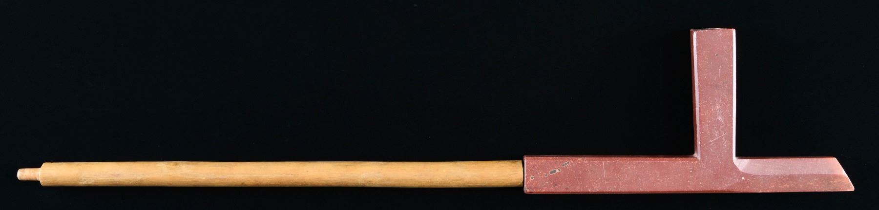 This pipe has an overall length of 24 1/2" with a rectangular chamfered head that measures 9 1/2" with a 4 3/4" high bowl. The round wooden stem is 15" long, including the 3/4" mouthpiece. CONDITION: the Catlinite head shows very minor wear to the edges and some charring around the bowl. The wooden stem generally shows light wear. (02-23593/BF). $1,000-1,500.