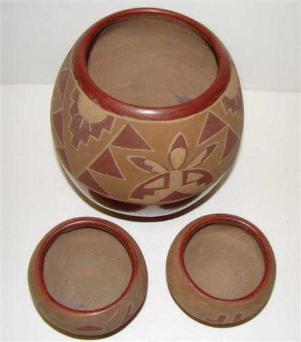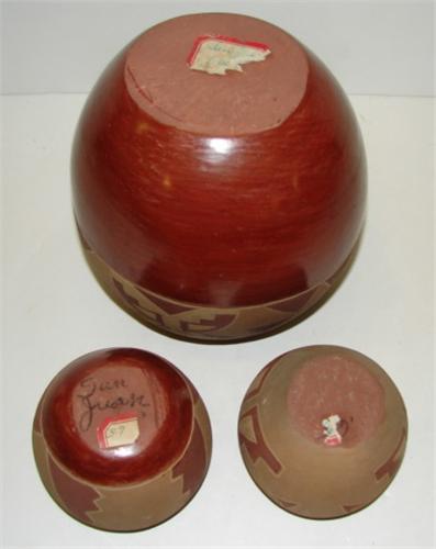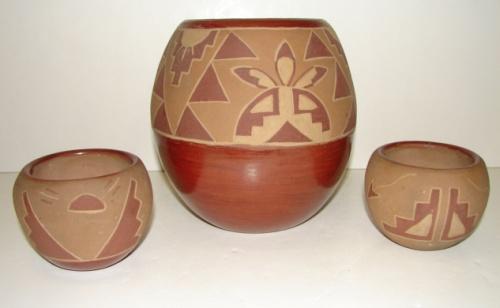 NATIVE AMERICAN DECORATED REDWARE SET. Consists of one large vase (6.25” H) and two small vases (2.5” H). One small vase is marked “San Juan”.