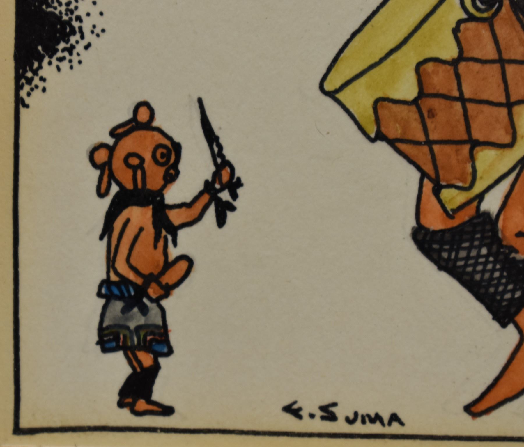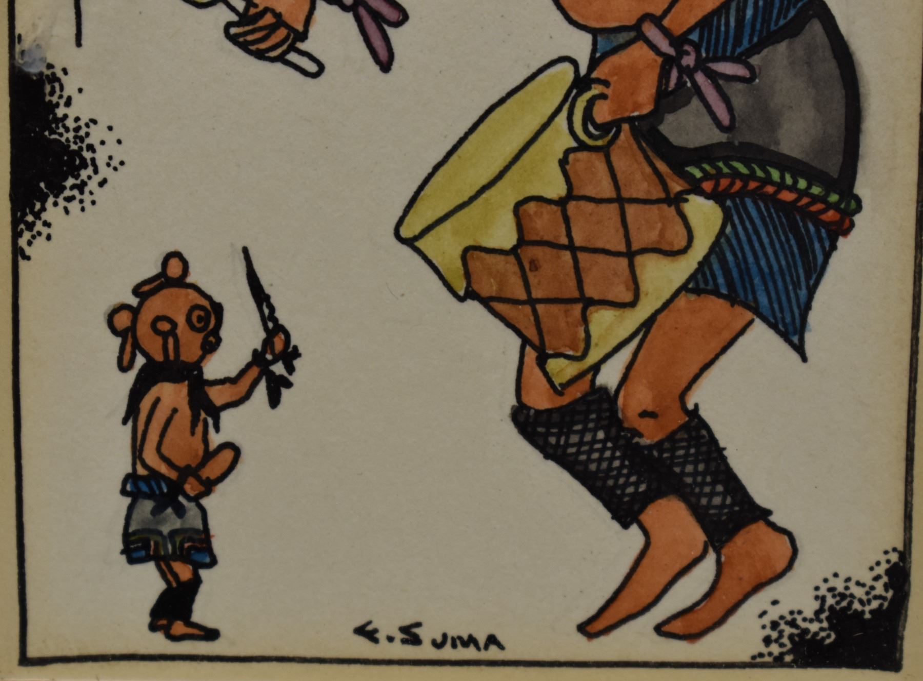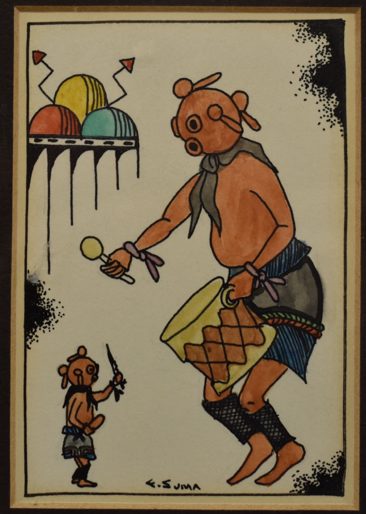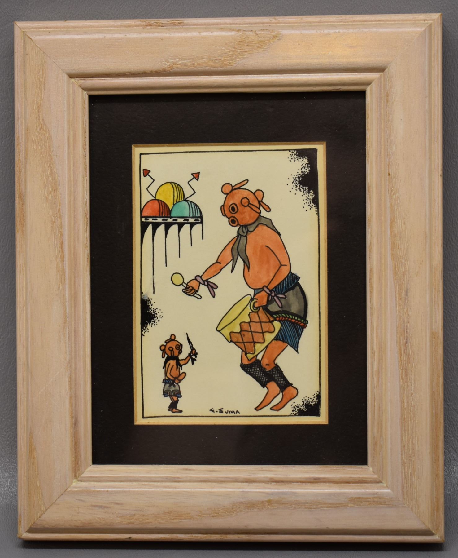 1980-90's Hopi Indian hand painted watercolor on paper signed F Suma 2.5" x 3.75" matted and framed to 5.75" x 7"