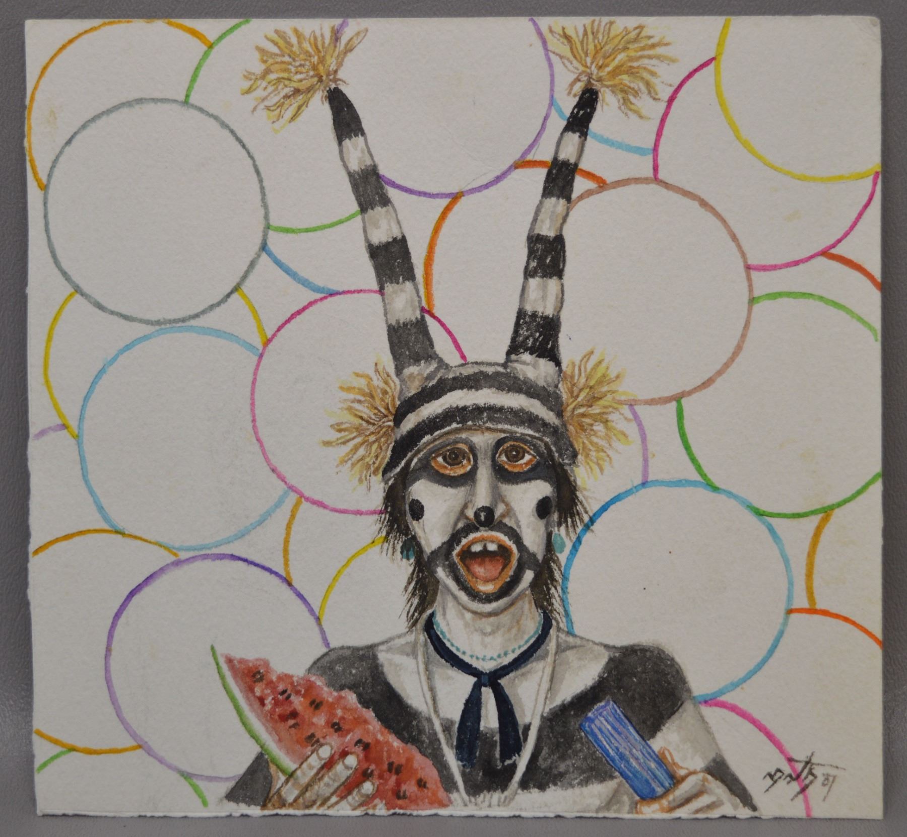 2007 hopi indian hand painted on paper depicting koshari signed Neil David 6.5" x 7"
