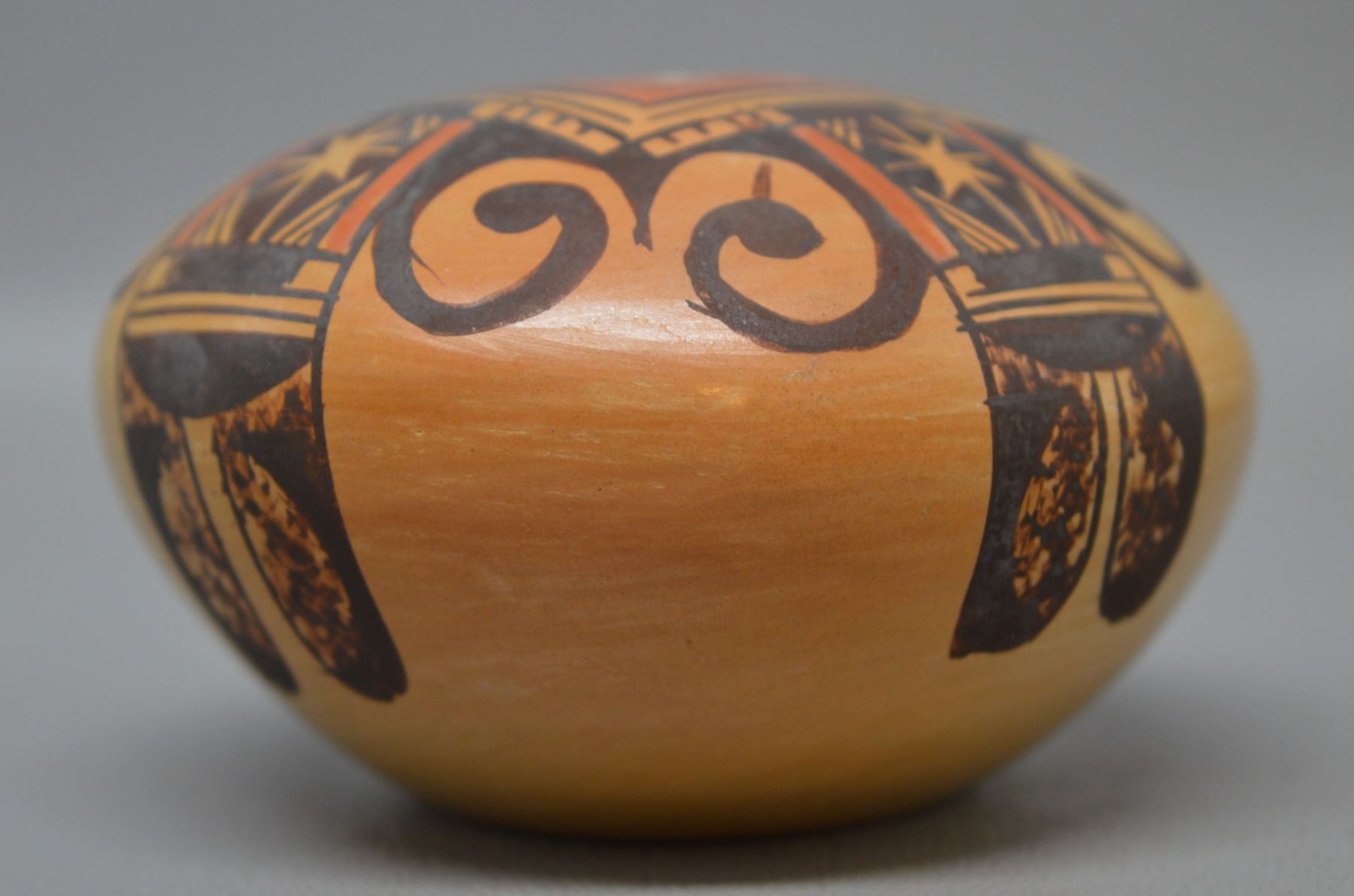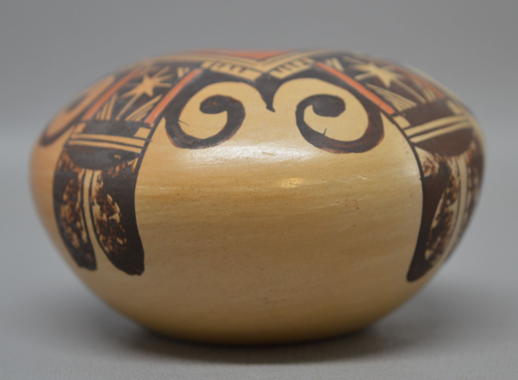 1980-90's hopi indian hand coiled and polychrome painted design signed Adelle Nampeyo 1.75" x 3.25" includes photo of artist
