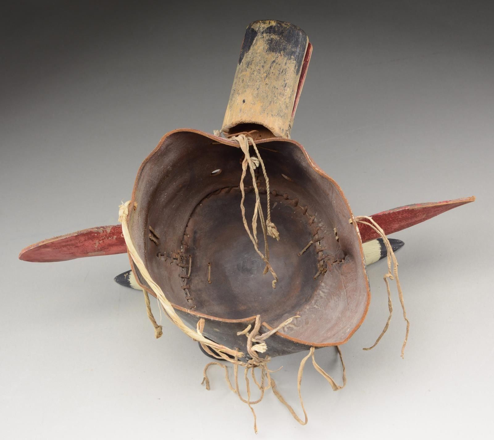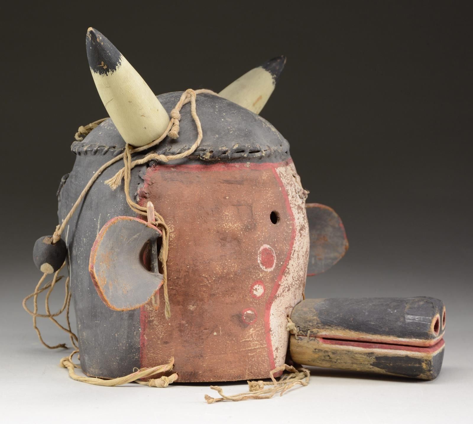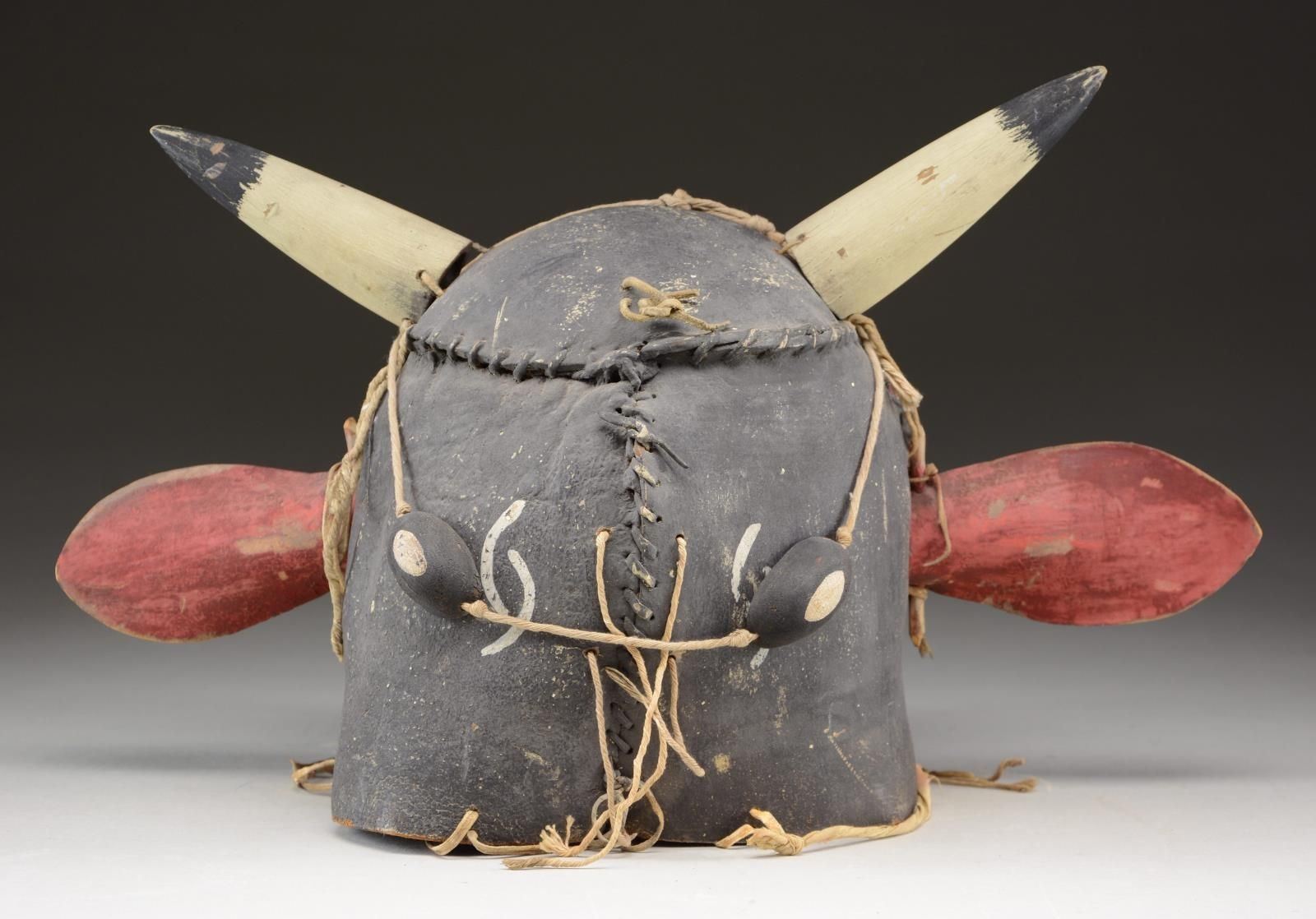 HEAD MASK. 9" tall, 8" diameter painted 3-piece leather seamed with rawhide & cord, attached leather ears, wood snout & horns. CONDITION: fair to good, snout is loose and has been resewn and reattached, chipped worn paint. PROVENANCE: Martin Lane Historic & Western Americana Lifetime Collection. (02-21631/JS). $600-800.