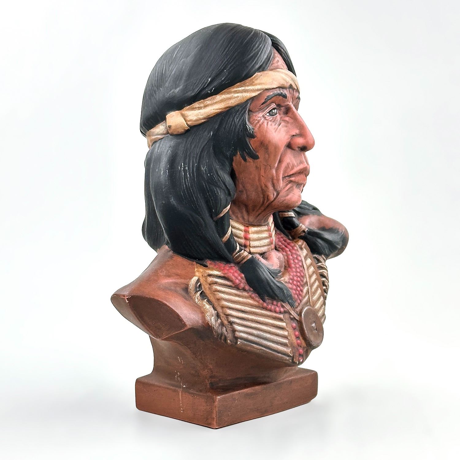 #8219 - VINTAGE NATIVE AMERICAN INDIAN CHIEF. HAND CRAFTED AND PAINTED CERAMIC HEAD FIGURE. HOME OR OFFICE DECOR BUST SCULPTURE. MEASURES: 9” (23 CM) WIDE FROM FRONT BY 5” (13 CM) DEEP AND STANDS 11” (28 CM) TALL