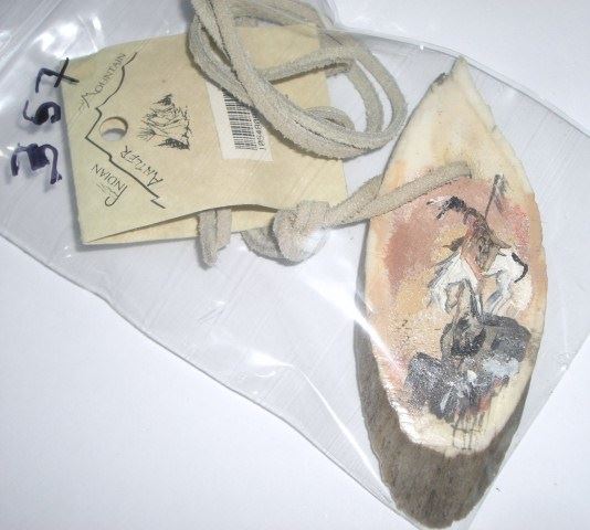 NATIVE AMERICAN INDIAN PAINTED *INDIAN ON HORSE* ON ELK ANTLER WITH LEATHER NECKLACE *HANDMADE-BRAND NEW IN PACKAGE* BY INDIAN MOUNTAIN. RETAIL TAG WAS $39.99!! ITEM CAME OUT OF SAFE DEPOSIT BOX!! ***Coin, Currency & All Items Listed in this auction - Grades, Conditions and Values are not Safe Deposit Coins LLC Responsibilty. Grades, Condition and Values are determined by Consigner(s) & Buyers ONLY