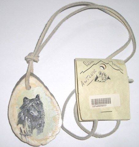 NATIVE AMERICAN INDIAN PAINTED *WOLF* ON ELK ANTLER WITH LEATHER NECKLACE *HANDMADE-BRAND NEW IN PACKAGE* BY INDIAN MOUNTAIN. RETAIL TAG WAS $39.99!! ITEM CAME OUT OF SAFE DEPOSIT BOX!! ***Coin, Currency & All Items Listed in this auction - Grades, Conditions and Values are not Safe Deposit Coins LLC Responsibilty. Grades, Condition and Values are determined by Consigner(s) & Buyers ONLY