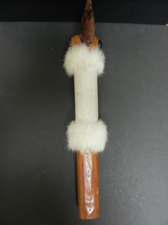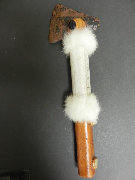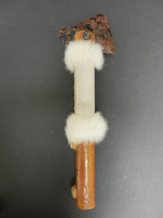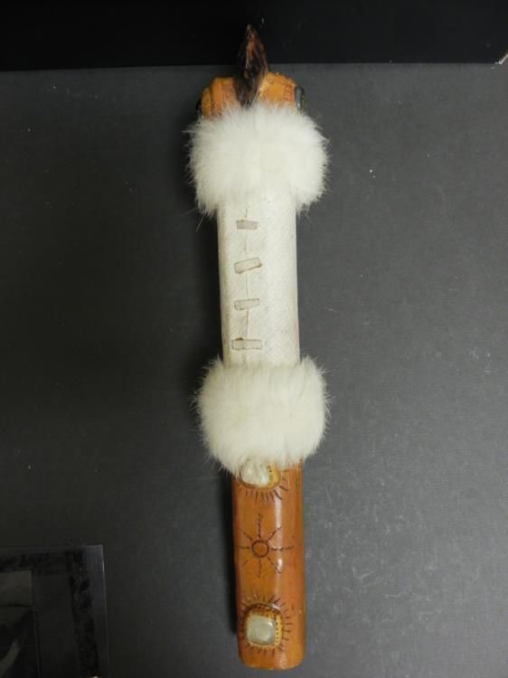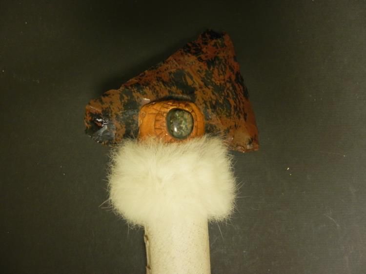 HERE IS A NATIVE AMERICAN/INDIAN WAR AXE--LEATHER COVERED W/STONES. 14" LONG--INTERESTING PIECE --PROBABLY CONTEMPORARY, NOT SURE--AXE HEAD TOP--STONES MOUNTED IN 4 PLACES--WHITE LEATHER TOP PART WITH FUR AN TOP AND BOTTOM--MOLDED BOTTOM SECTION WITH SYMBOLS