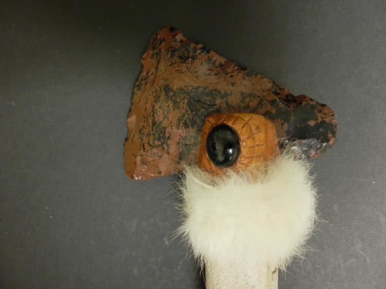 HERE IS A NATIVE AMERICAN/INDIAN WAR AXE--LEATHER COVERED W/STONES. 14" LONG--INTERESTING PIECE --PROBABLY CONTEMPORARY, NOT SURE--AXE HEAD TOP--STONES MOUNTED IN 4 PLACES--WHITE LEATHER TOP PART WITH FUR AN TOP AND BOTTOM--MOLDED BOTTOM SECTION WITH SYMBOLS
