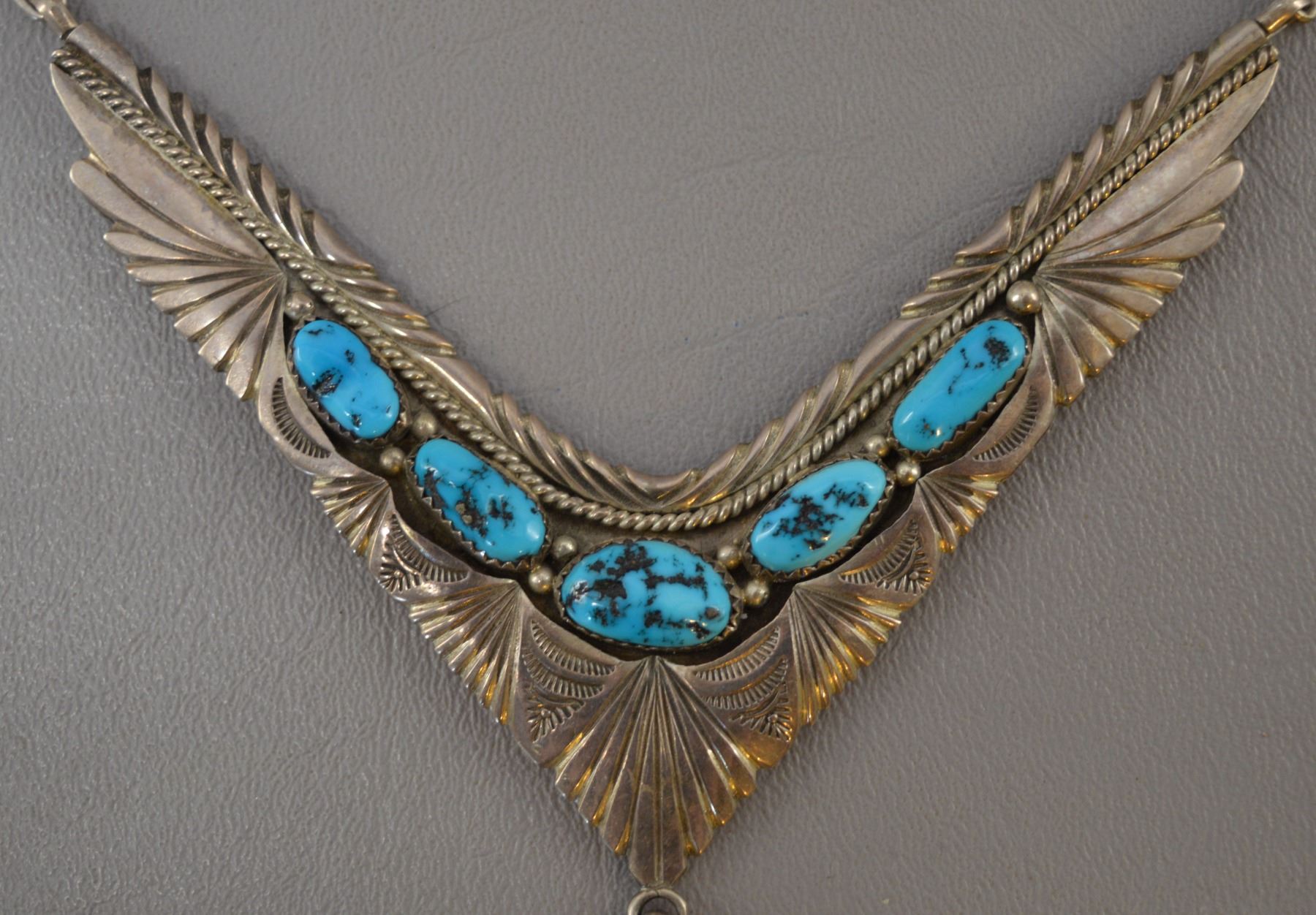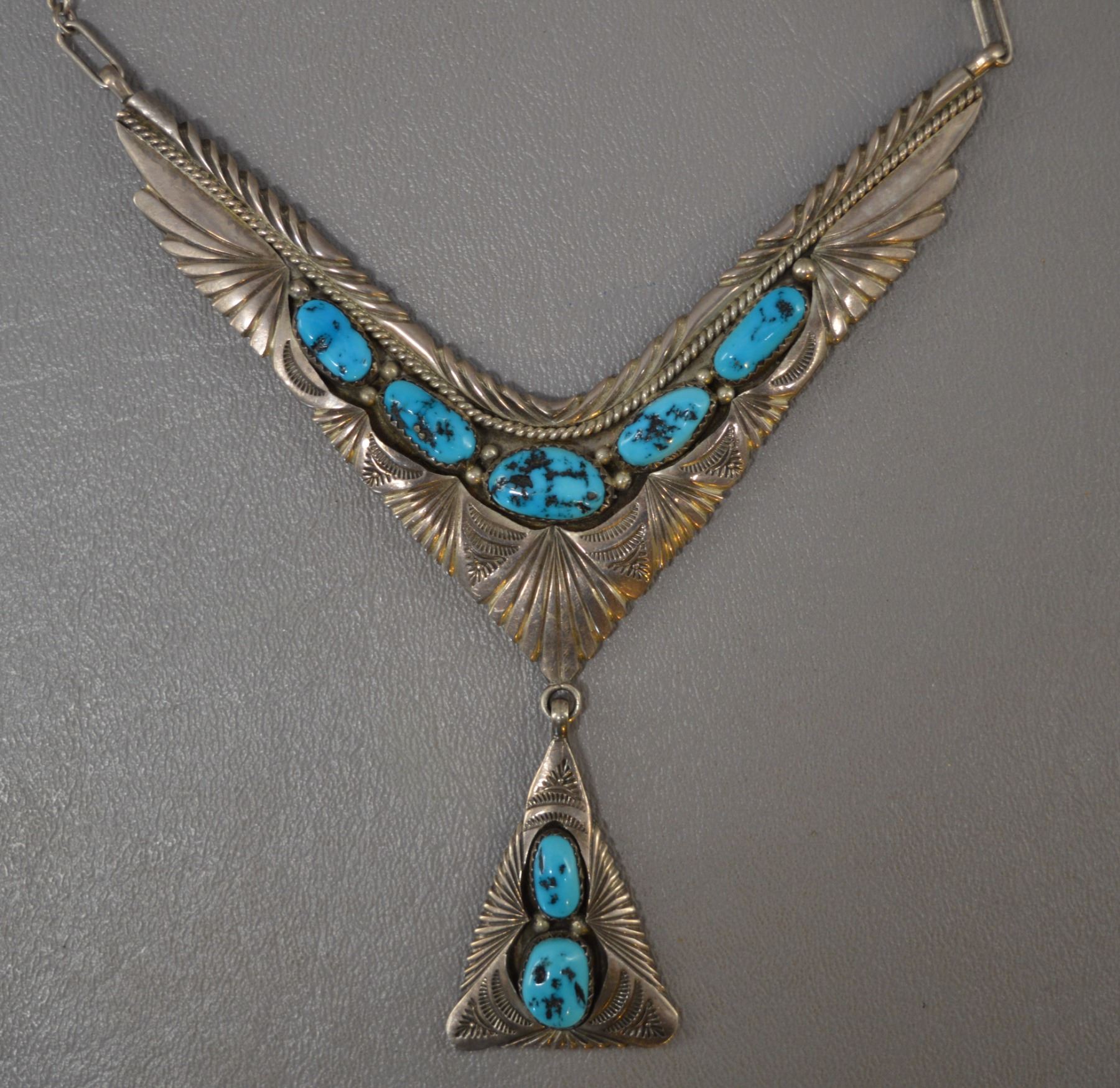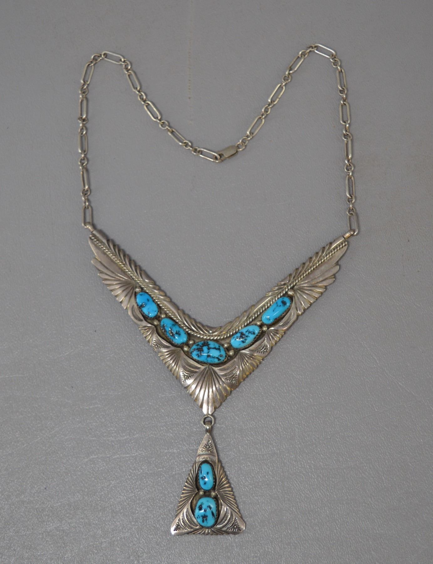 1980-90's navajo indian sterling silver hand stamped design with turqouise stones 5" x 5" and hand made silver chain 12" long signed with H
