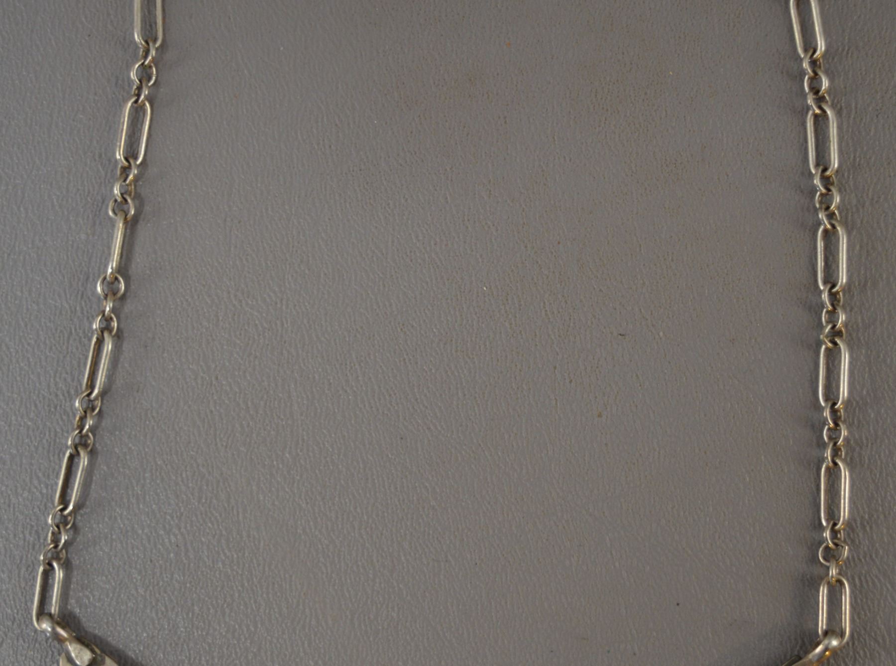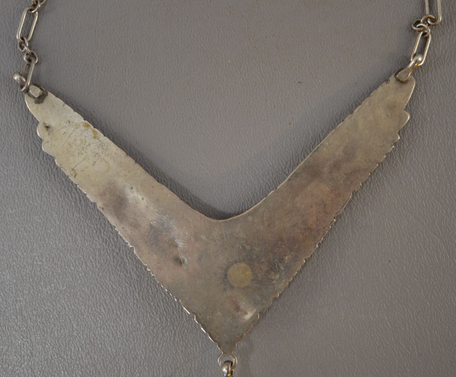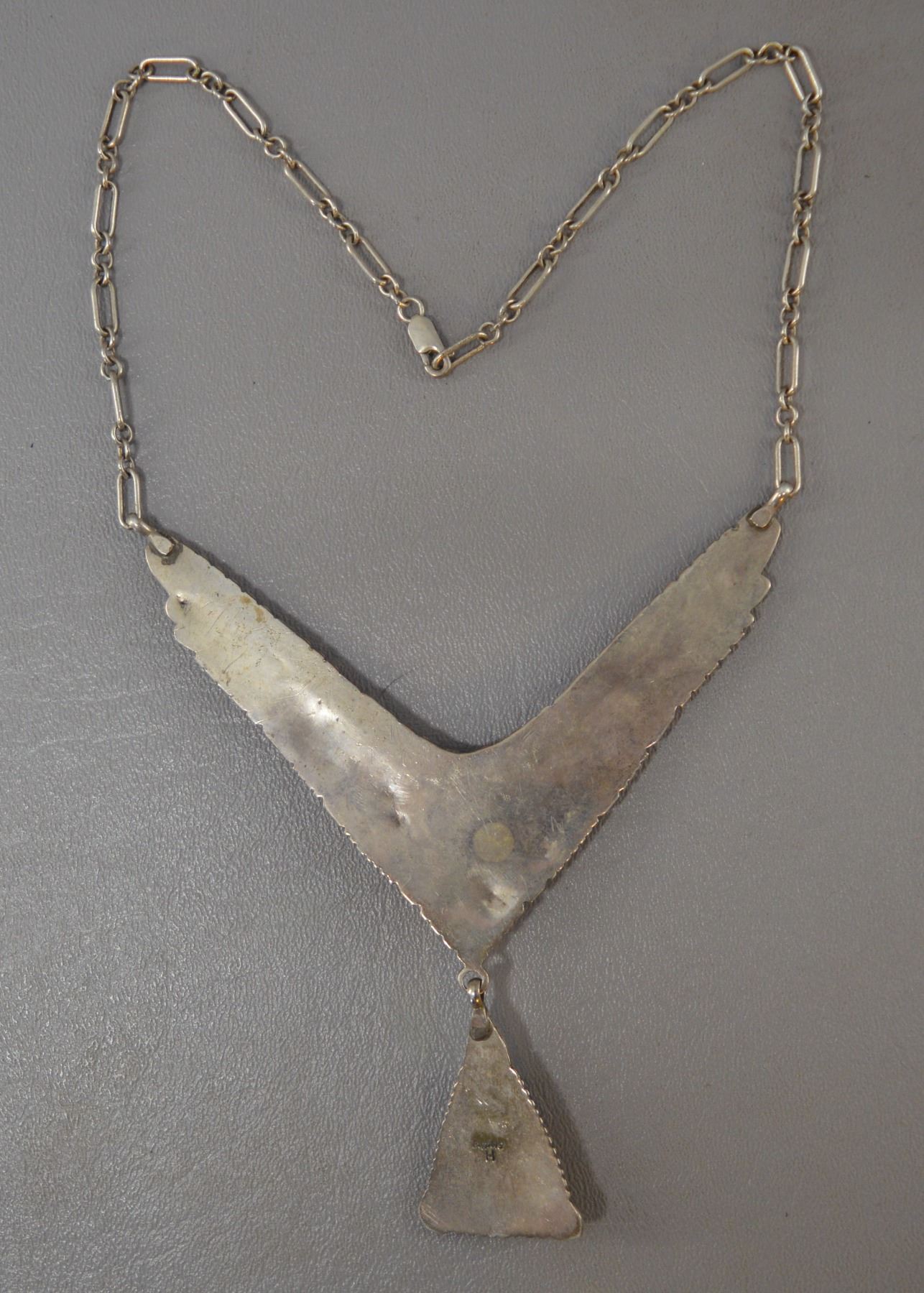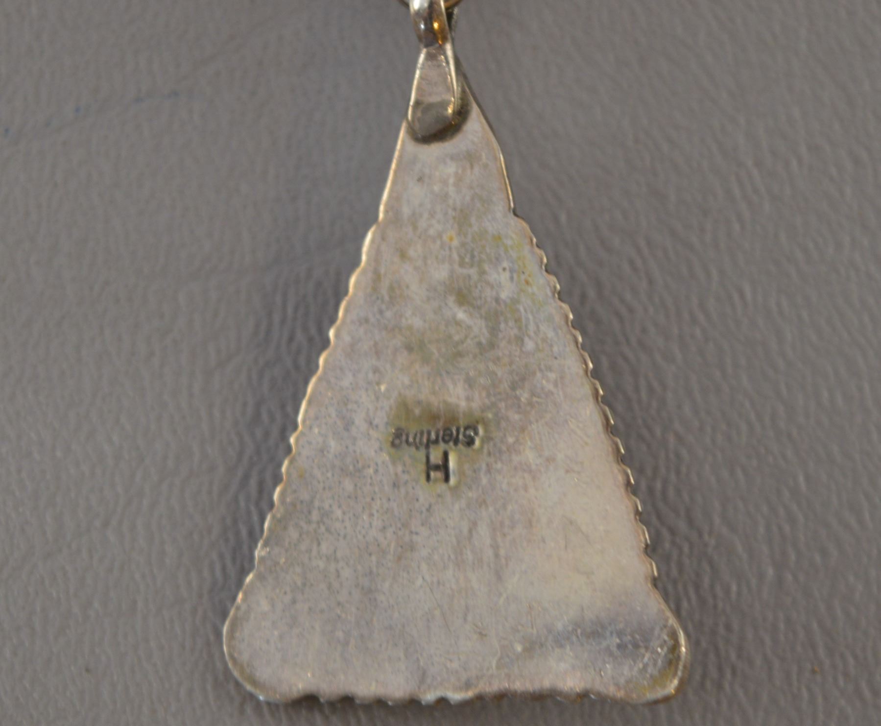 1980-90's navajo indian sterling silver hand stamped design with turqouise stones 5" x 5" and hand made silver chain 12" long signed with H
