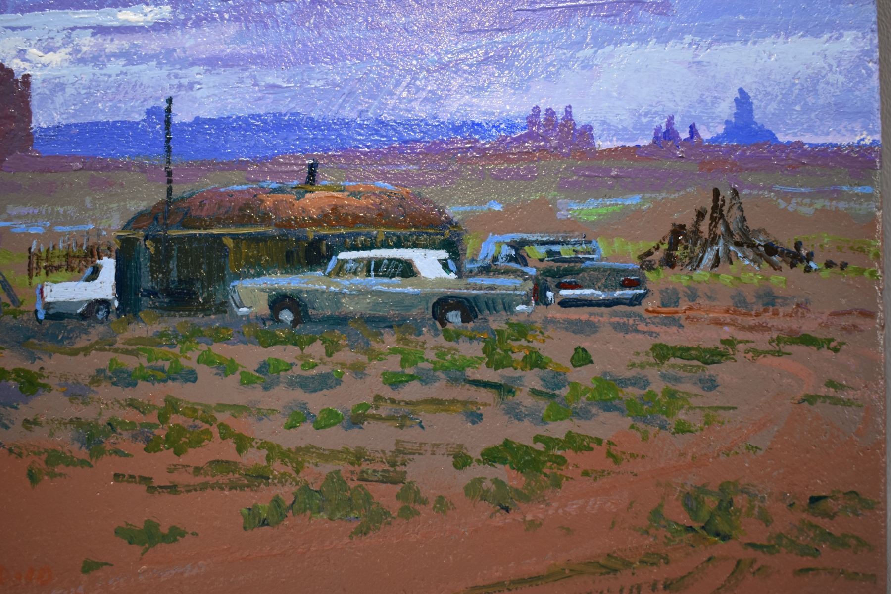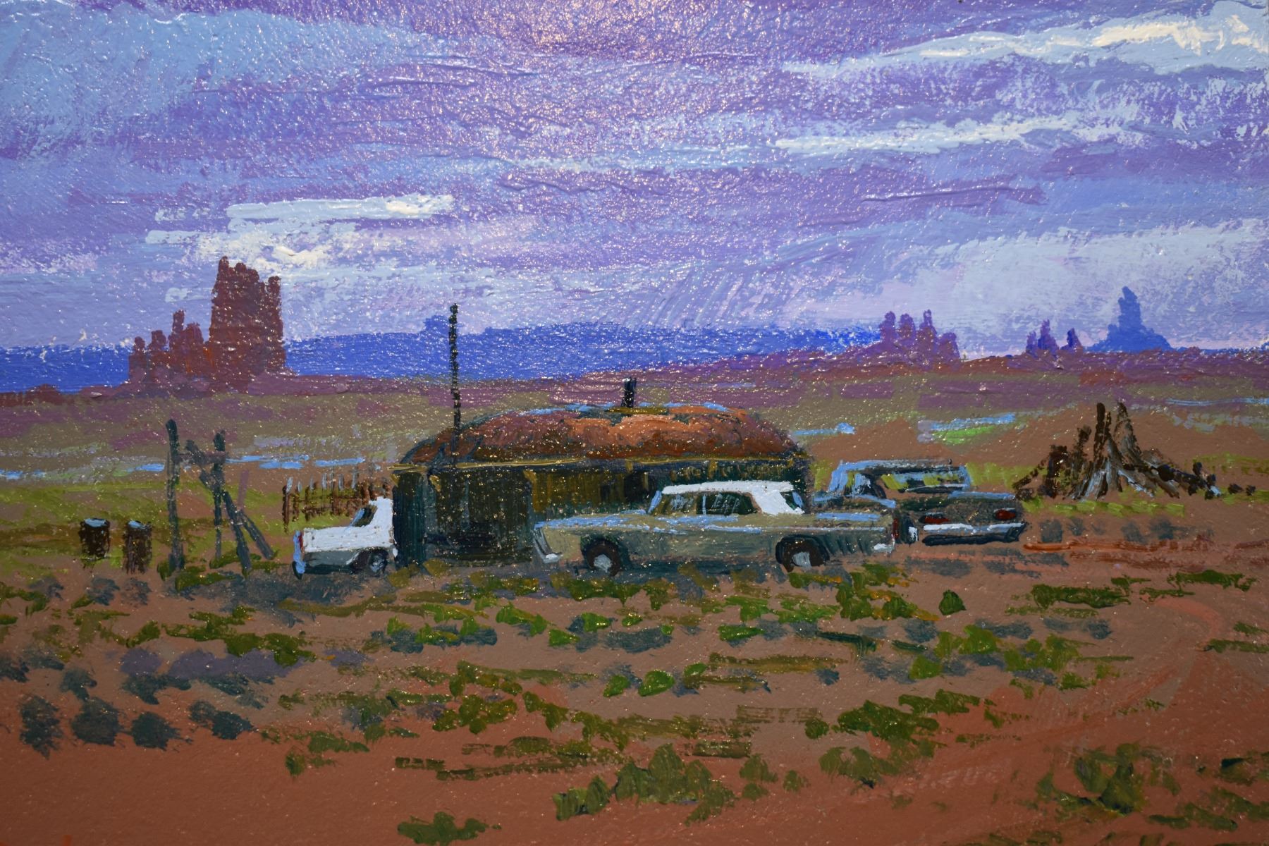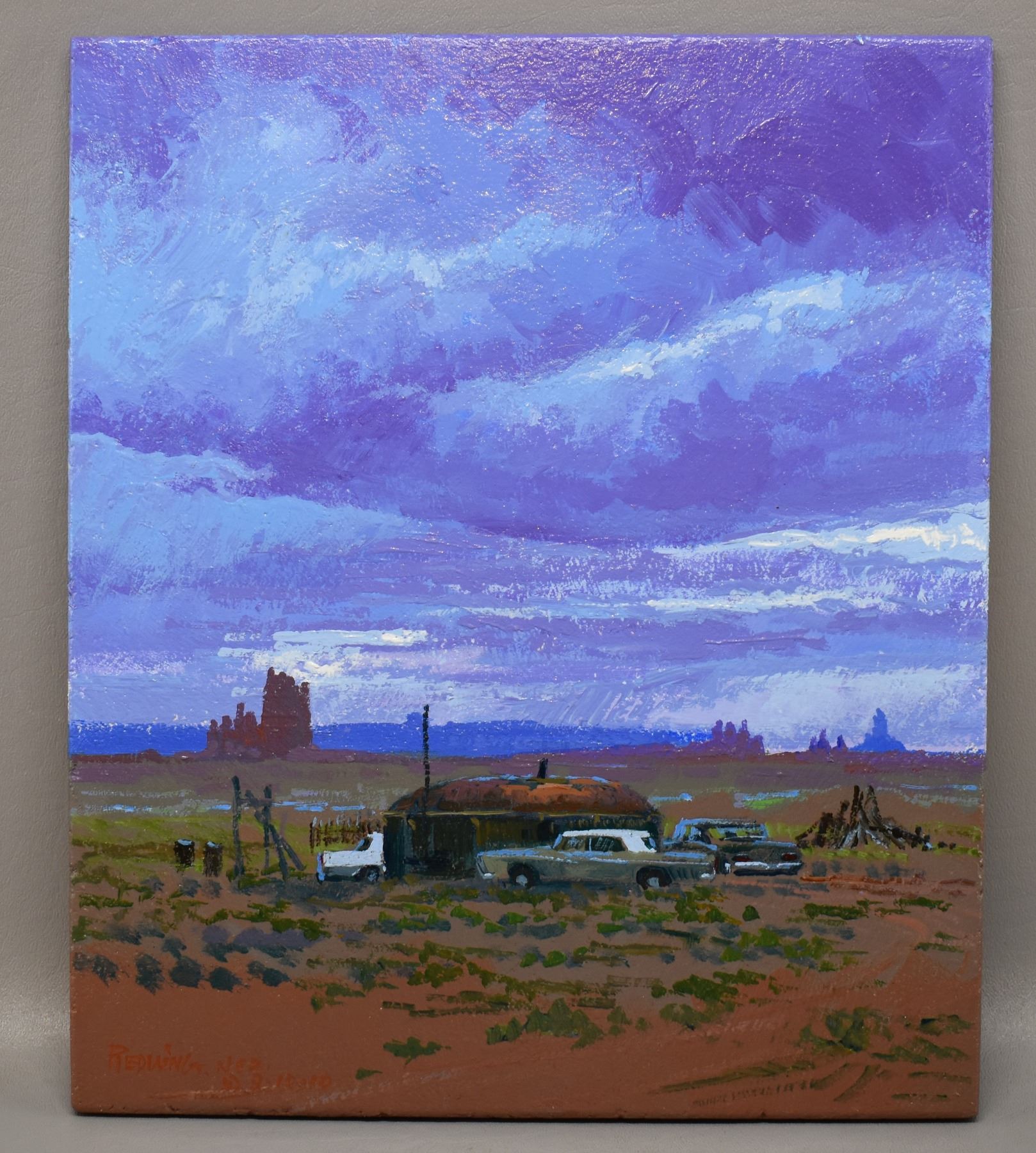 2010's Navajo Indian hand painted on board depicting Navajo Hogan with cars titled Kayenta Shower signed Redwing Nez 10" x 12"