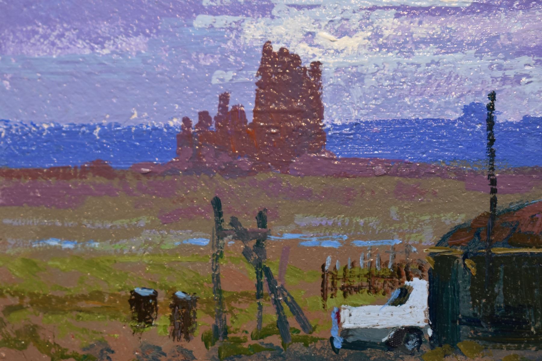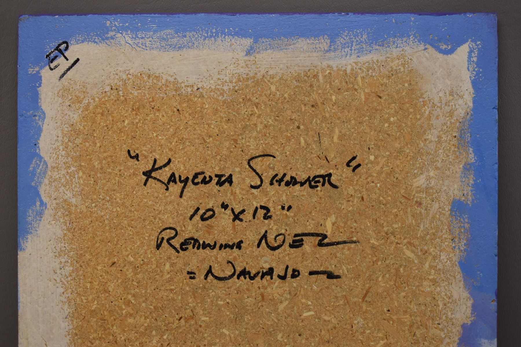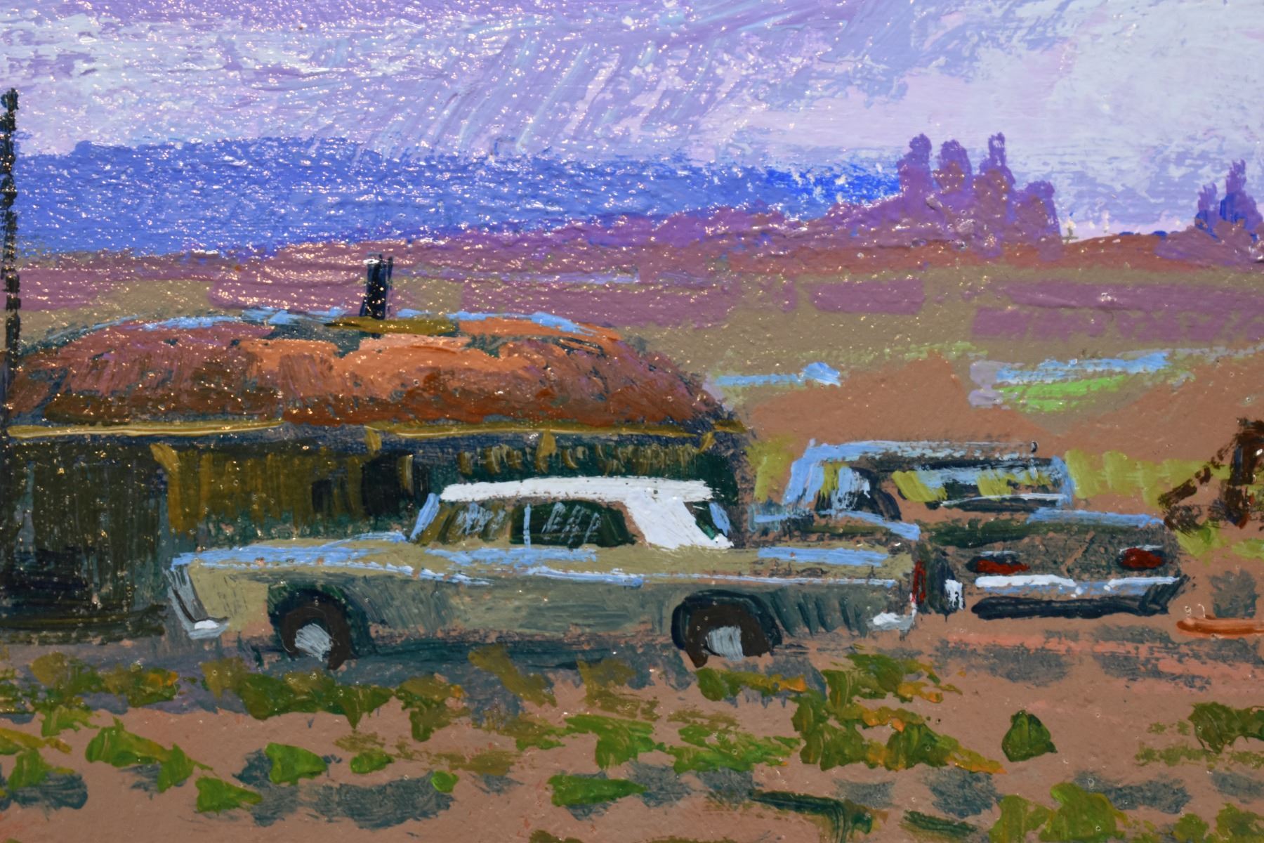 2010's Navajo Indian hand painted on board depicting Navajo Hogan with cars titled Kayenta Shower signed Redwing Nez 10" x 12"
