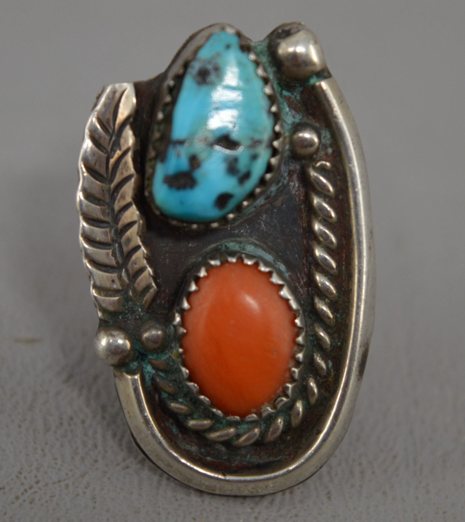1980's navajo indian sterling silver with turqouise and coral signed Mary Billy size 5.5